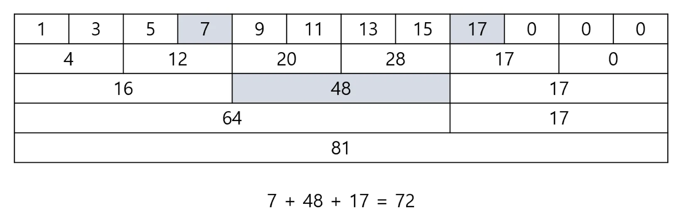 4번쨰 원소(7)부터 9번째 원소(17)까지의 구간합을 구하는 경우 다음과 같은 방식으로 진행됩니다.