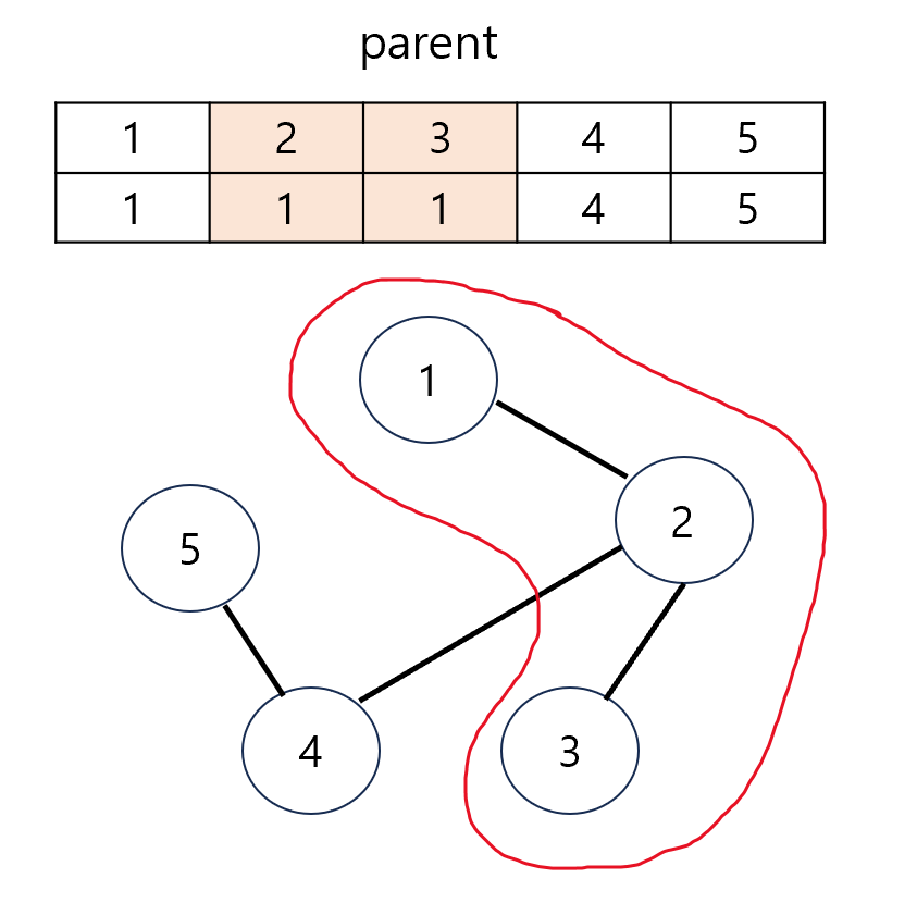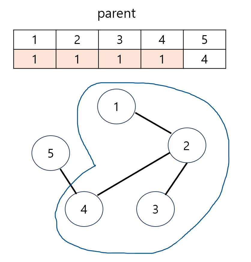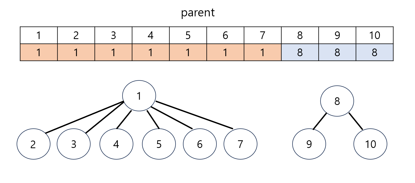 이를 위해 find메서드를 활용하고, parent배열 참조를 통해서 루트 노드를 찾을 수 있습니다.
