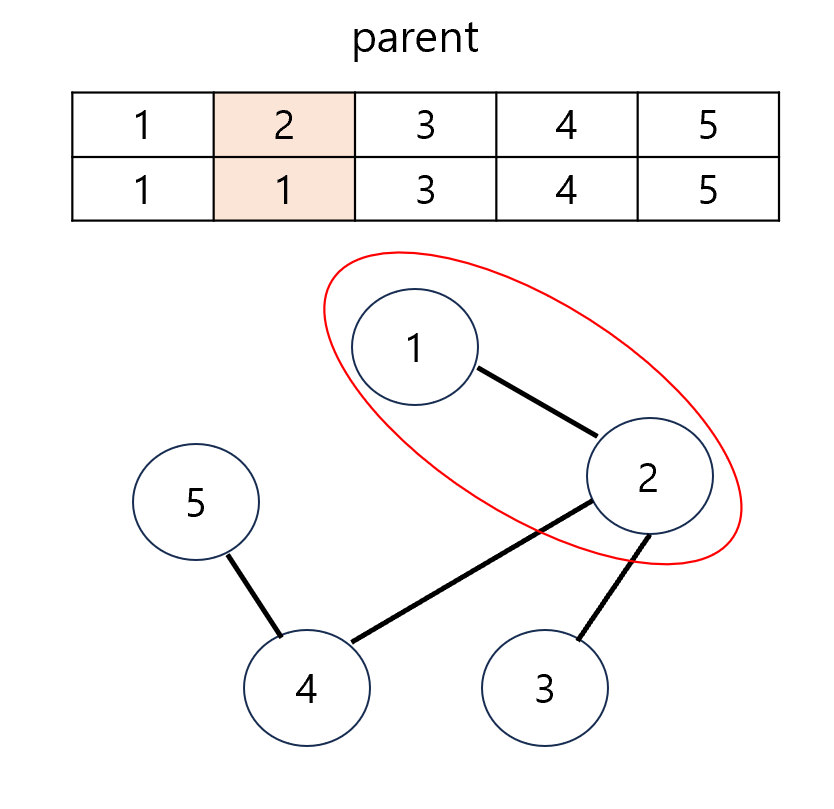 그림 상으로는 1,2,3,4,5 모든 정점이 서로 연결되어 있고, union메서드를 통해 모든 정점이 하나의 집합으로 만들어져야 한다는 걸 머리로는 이해할 수 있습니다.