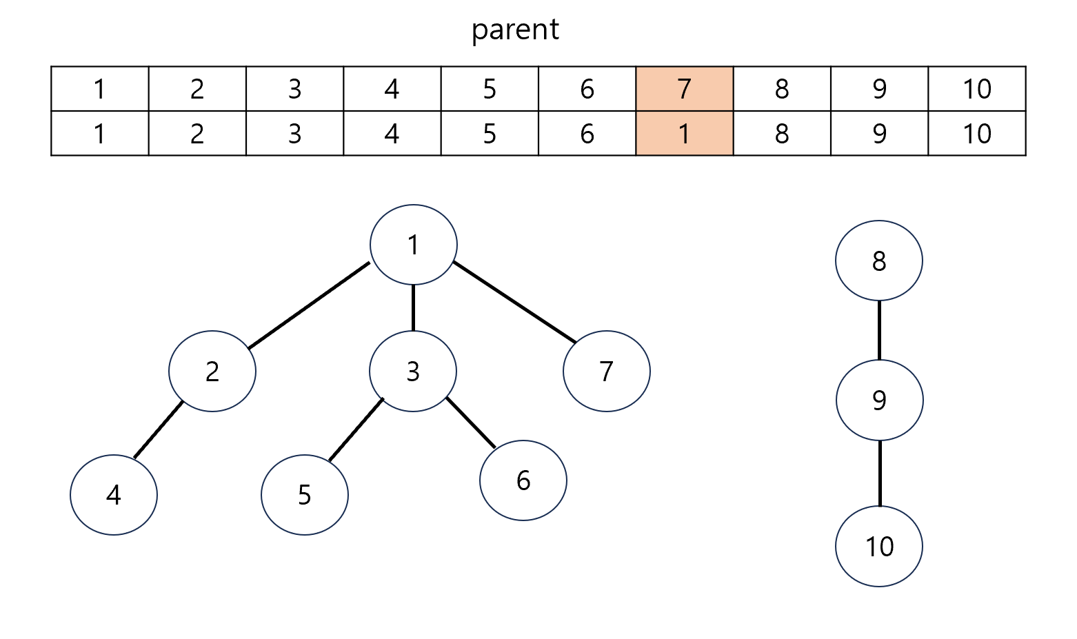 위 그림에서 union(1,7)을 수행하게 될 경우 다음처럼 변경됩니다.