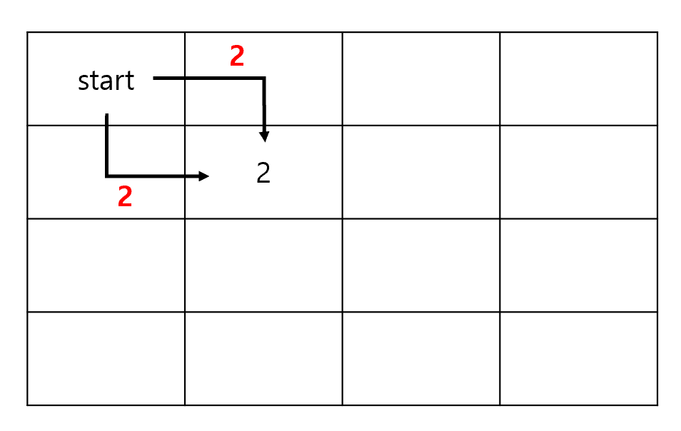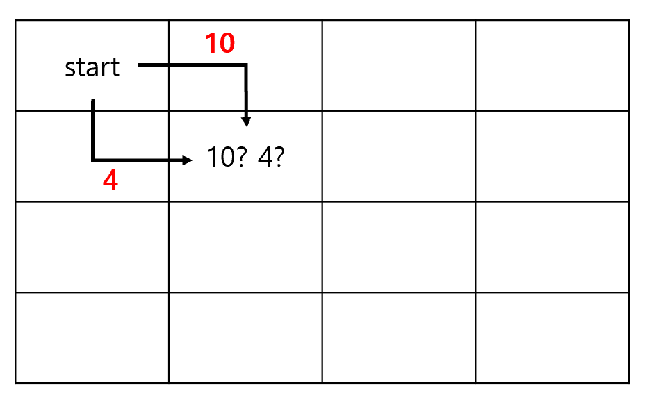 BFS의 경우 만약 방향벡터를 오른쪽먼저 탐색하게 된다면 (1,1)은 10이 되고, 아래쪽부터 탐색하게 되면 4가 됩니다.