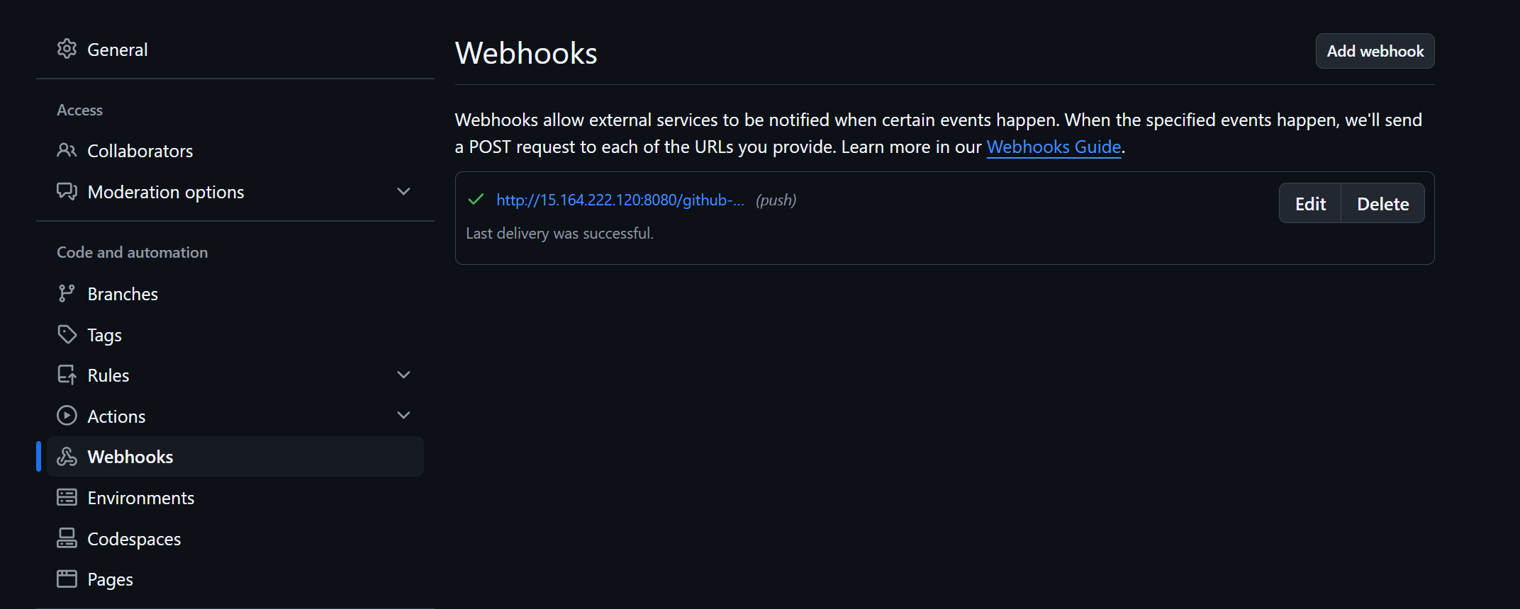 + 아무래도 아이템 등록 시 Jenkins에서 최초 한번 수동으로 빌드를 해야지 웹훅을 수신할 수 있게 되는 것 같습니다.