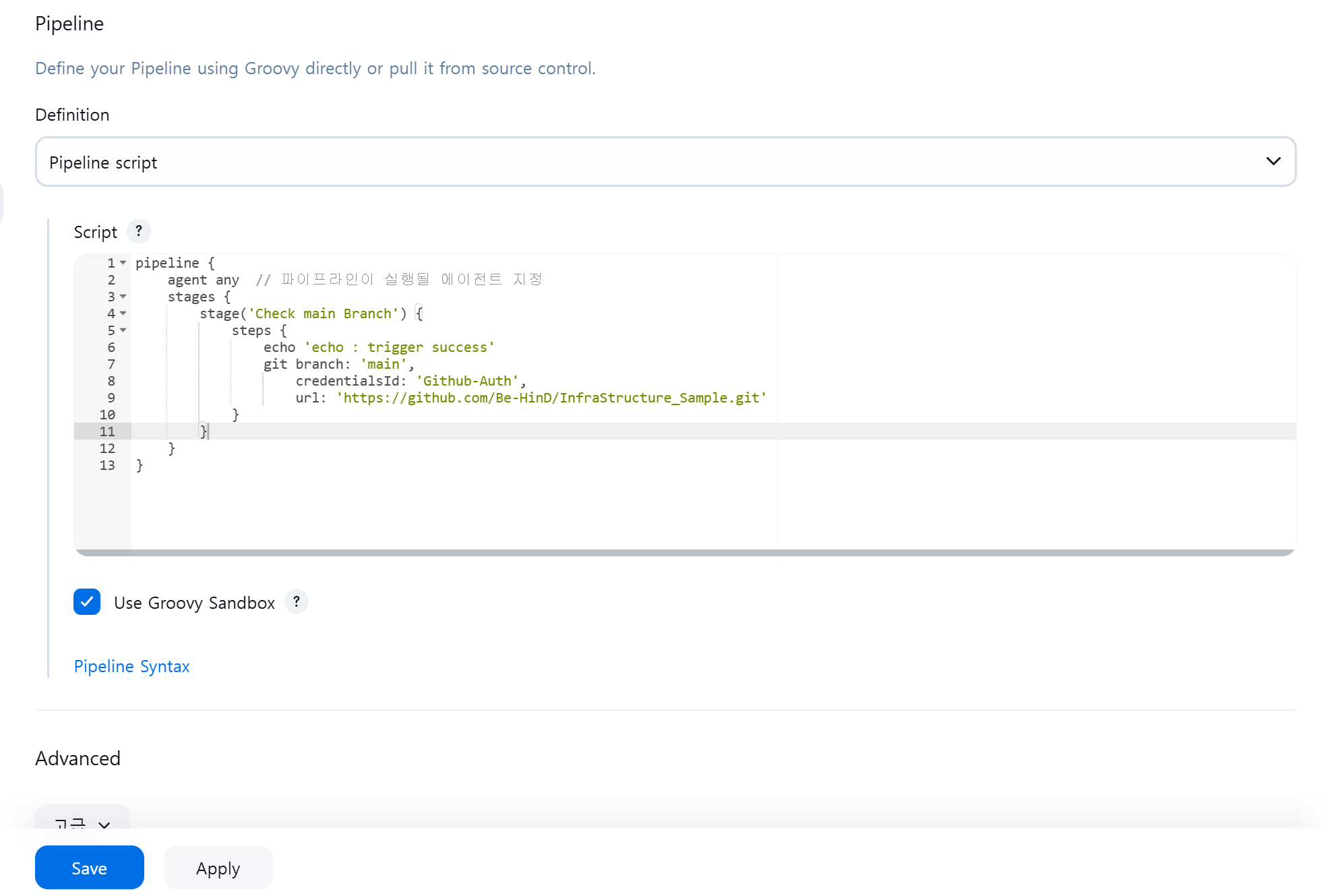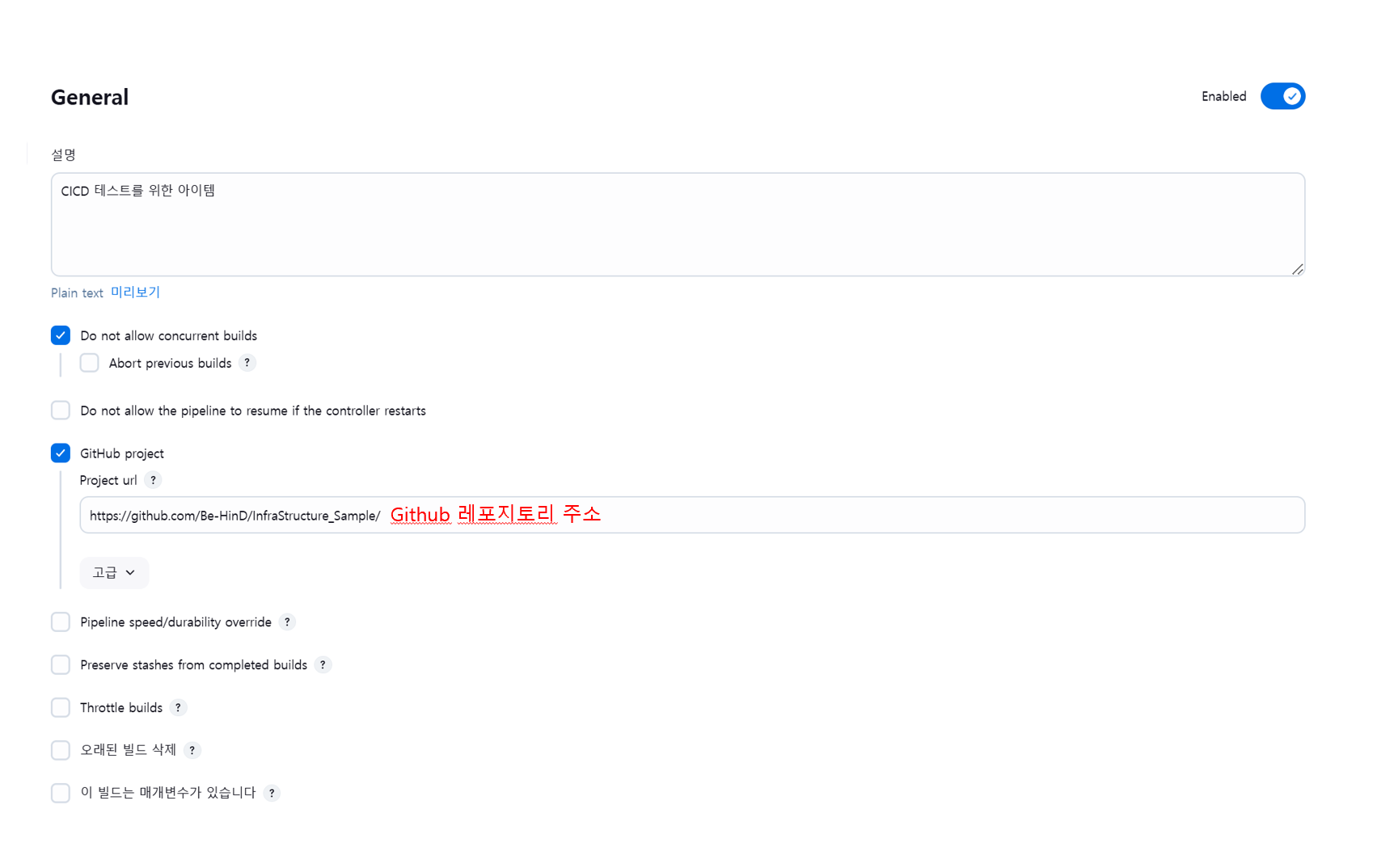 - 이 파이프라인이 Github 저장소와 연동된 프로젝트임을 명시 (체크 시 Github 저장소 URL 입력 필드 생성)
