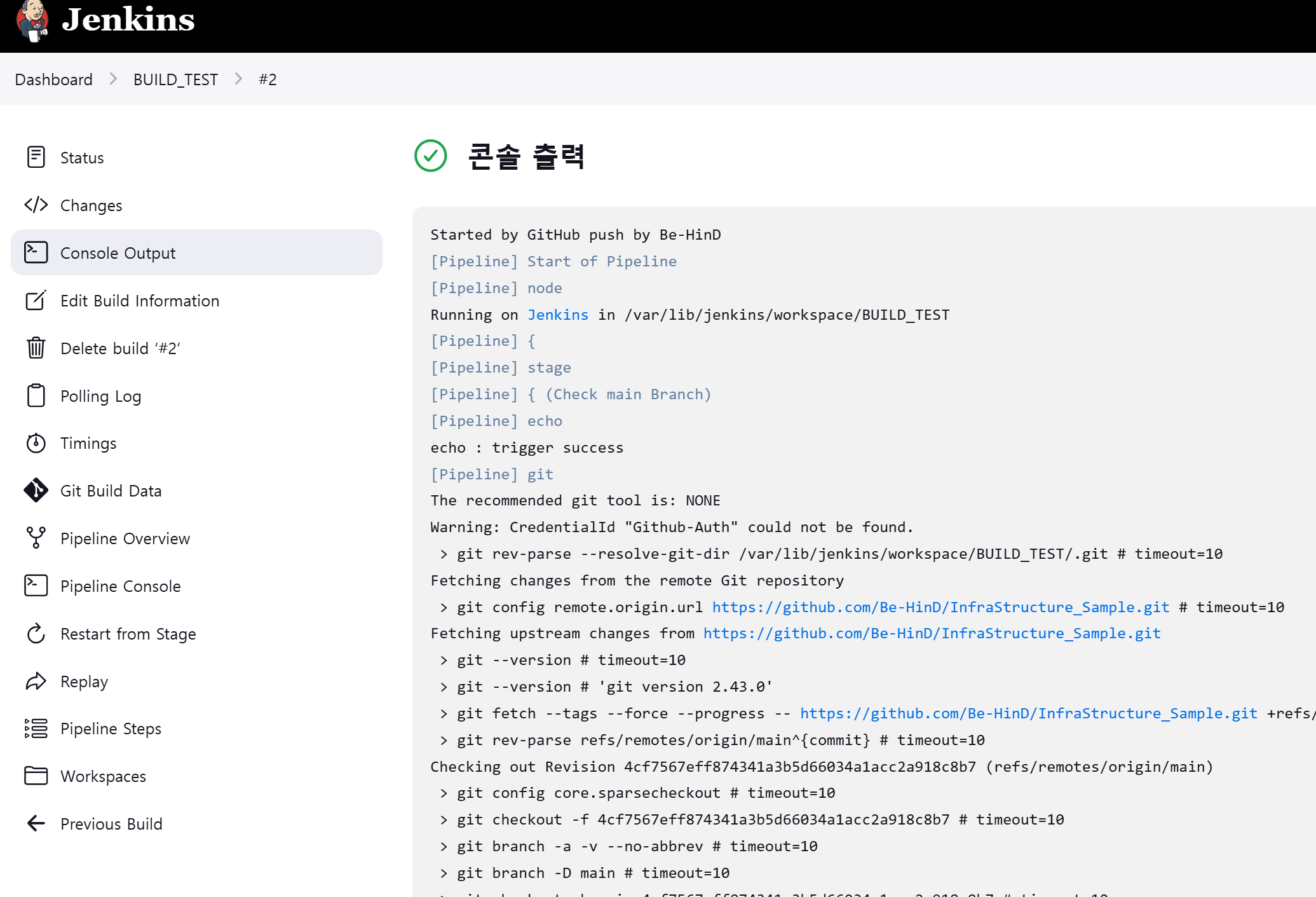 그럼 다시 Jenkins로 돌아가서 빌드가 제대로 유발되었는지 확인해보겠습니다.