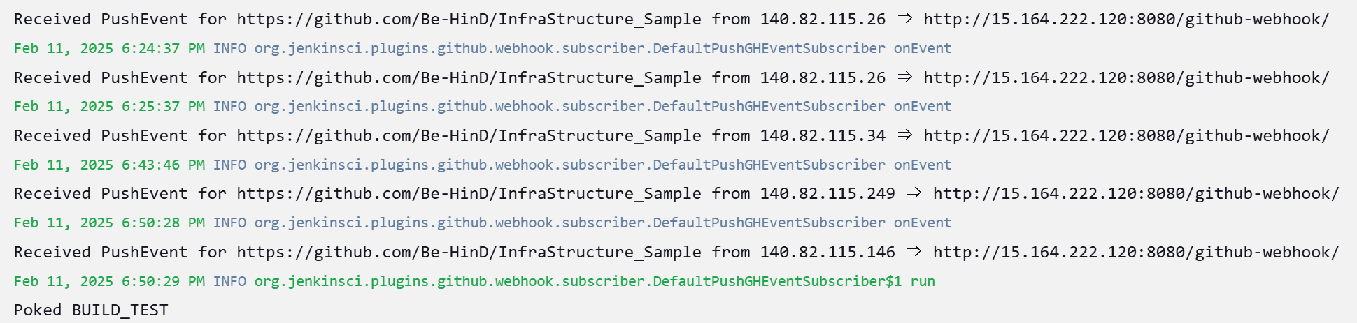 Dashboard -> Jenkins 관리 -> System Log를 통해 확인한 결과 정상적으로 PushEvent를 수신한 것을 확인할 수 있습니다.