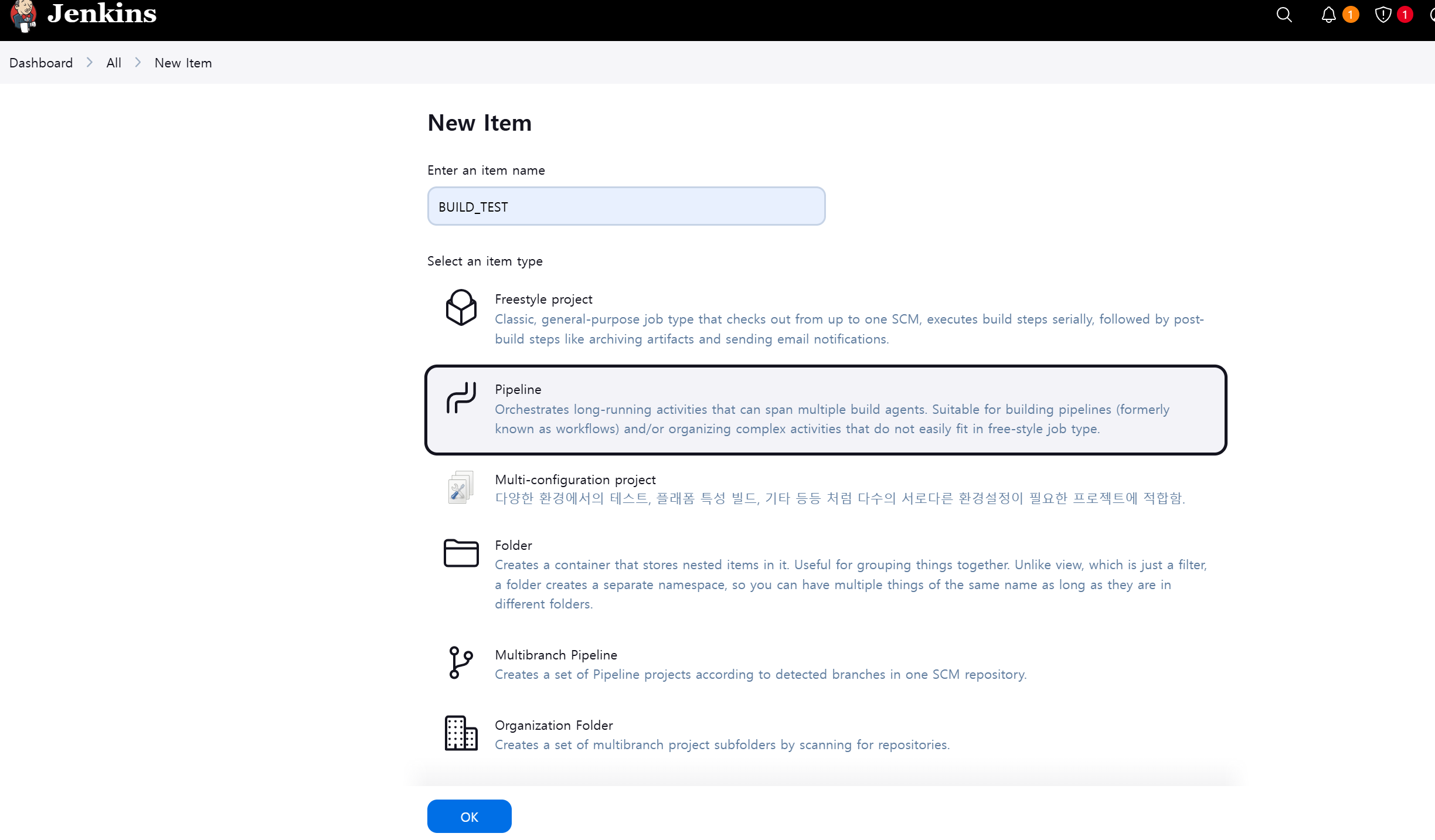 빌드 뿐만 아니라 배포까지 과정을 수행하기 위해 Pipeline 아이템으로 생성하겠습니다.