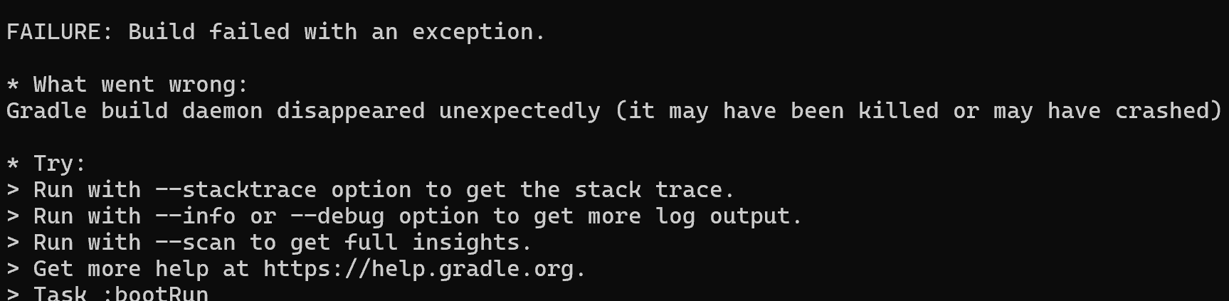 위 로그는 Gradle Daemon이 비정상적으로 종료되었거나 충돌했다는 것을 말하고 있었습니다.