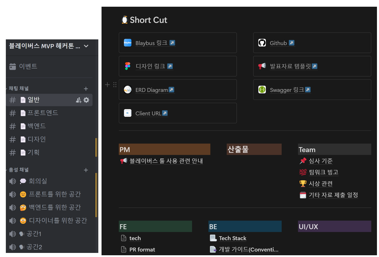 아이템에 대한 기획과 요구사항은 창업팀에서 어느정도 나온 상태였기에 곧바로 파트 별 미팅을 할 수 있게 디스코드 방을 개설하여 30분 정도의 추가적인 미팅을 진행 후 첫 팀미팅을 마칠 수 있었습니다.