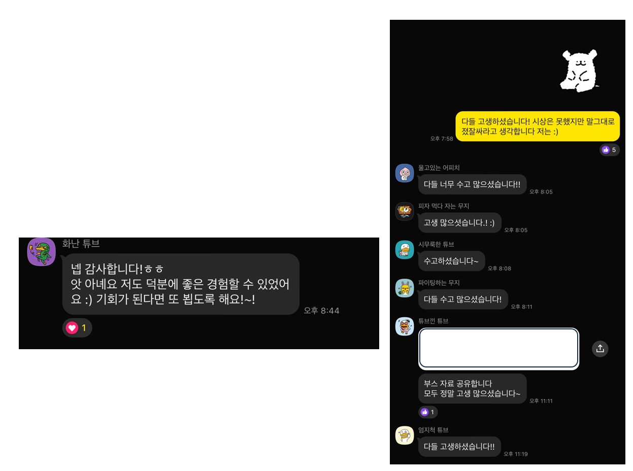 그래도 여차저차 모두가 힘써준 덕분에 추가 기능을 제외하고는 아슬아슬하게 마무리할 수 있었던 것 같아요.