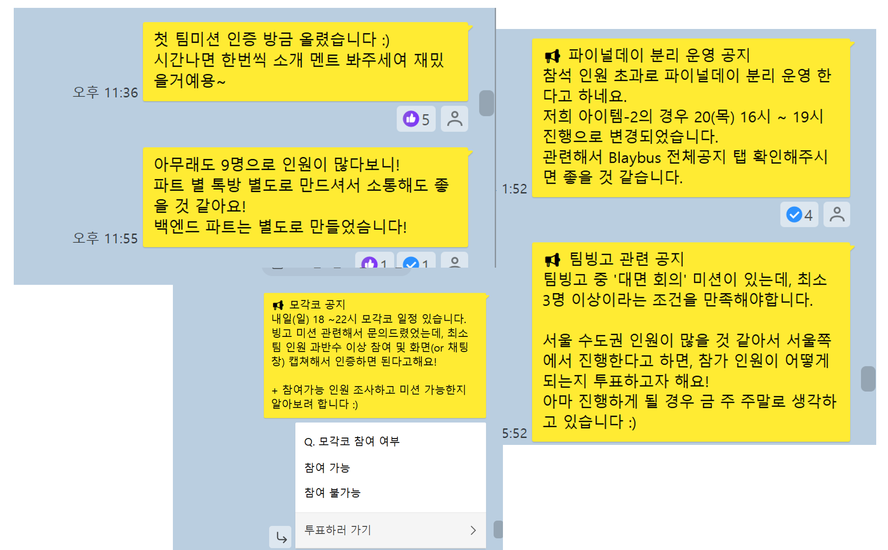 그렇다보니 각 파트의 진행 상황 공유와 연계되는 협업은 중요했고, 이 부분이 팀 전체적으로 부족했던 것 같다고 생각해요.