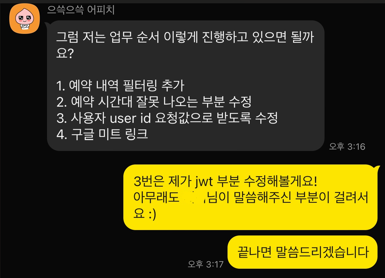 창업팀 측 백엔드 개발자분도 찾아오셔서 설계와 관련해 열띤 토론도 했었는데요. 제가 고민했던 부분들을 공감해주시고 피드백을 비롯해 엄청 재밌게 얘기 나눴던 것 같아요 :)