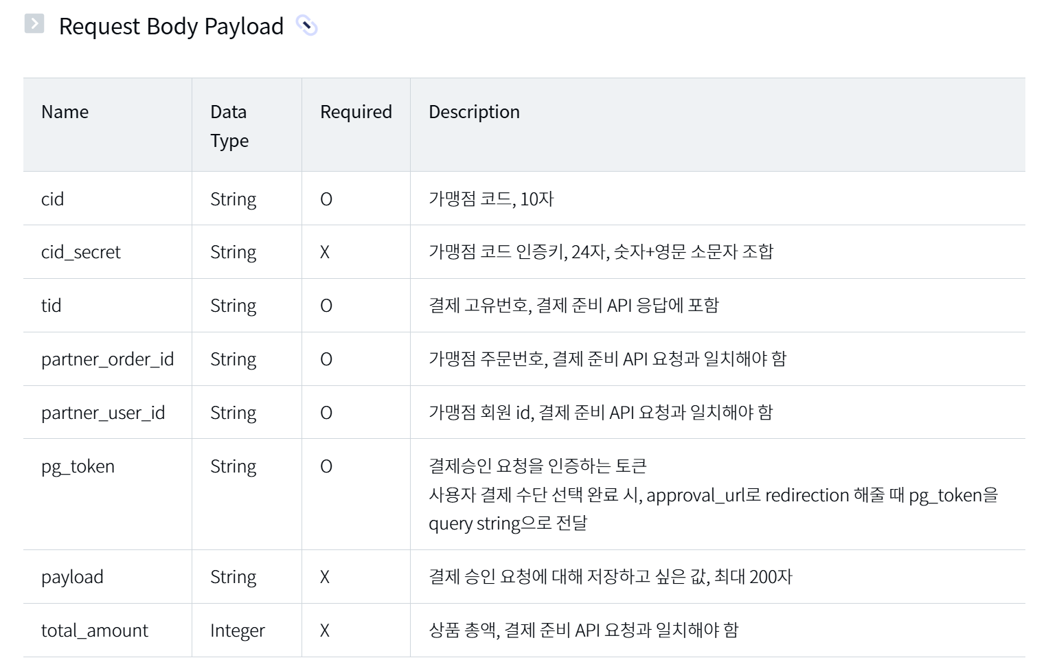 공식문서를 확인해보면 결제승인 API를 위한 요청값으로 tid와 pg_token이 필요하다.