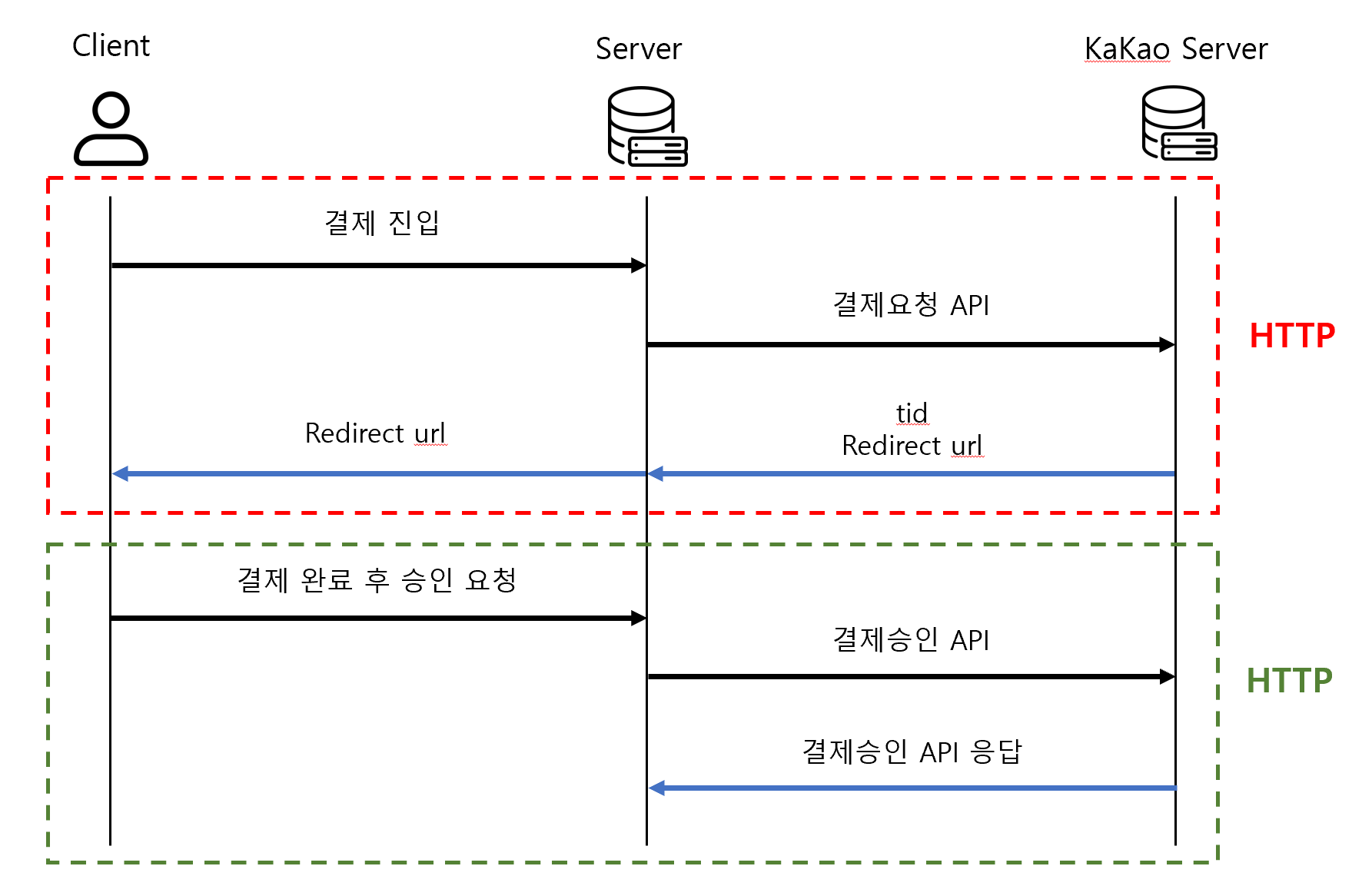클라이언트에서 결제가 필요한 시점에 우리의 서버로 필요한 요청 값을 보내고, 서버에서는 카카오로부터 결제요청API에 대한 응답값을 받아온다.