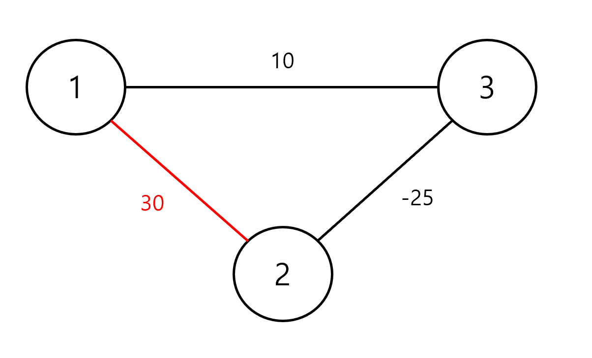 먼저 큰 차이로는 다익스트라의 경우 현재 정점을 기준으로 탐색을 진행하지만, 벨만-포드의 경우 간선을 기준으로 탐색을 진행하게 된다. 즉 위 그래프에서 '10', '30', '-25' 라는 간선을 기준으로 dist 배열을 갱신하게 된다.
