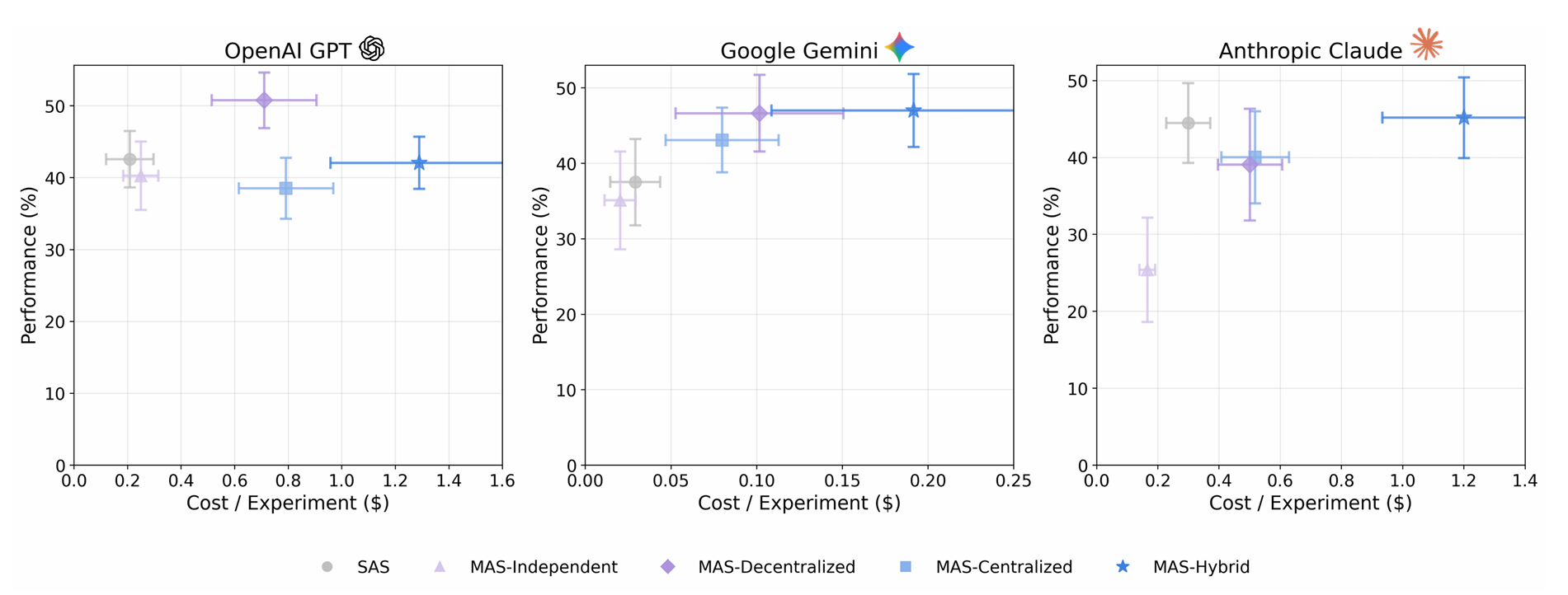 위 그림은 세 가지 LLM 제품군을 대상으로 BrowseComp-Plus 벤치마크에서 중앙 집중형과 분산형 아키텍처의 성능을 비교 분석한 결과이다. (고성능 모델로는 GPT-5, Claude Sonnet 4.5, Gemini-2.5 Pro가, 저성능 모델로는 GPT-5 nano, Claude Sonnet 3.7, Gemini-2.0 Flash가 사용되었다.)