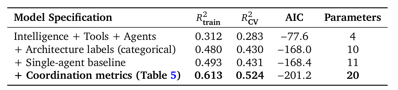 결론적으로 고정된 계산 예산 하에서, 에이전트가 3~4명을 넘어서면 개별 에이전트가 사용할 수 있는 추론 용량은 급격히 희박해진다.