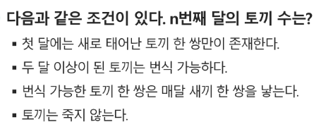 - Fi : Fi-2 + Fi-1 → 재귀로 구현
