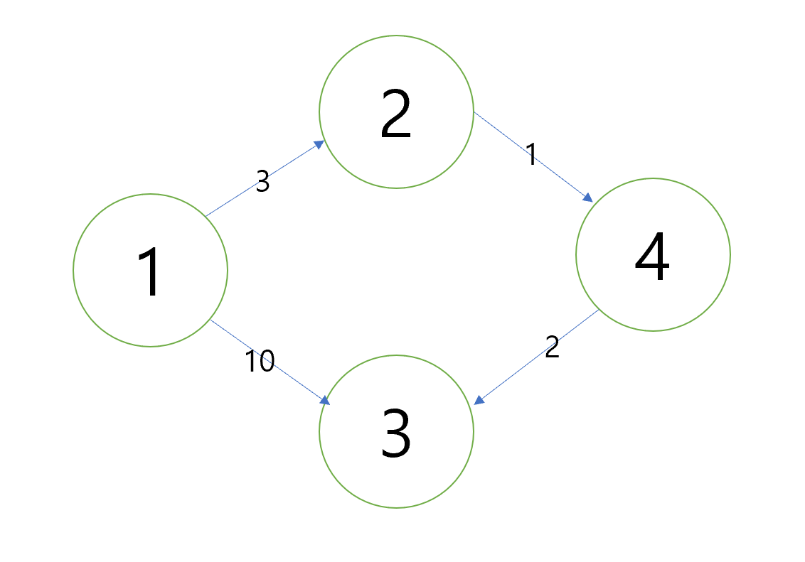 - 위와 같은 그래프에서 1 → 3으로 가는 최단거리는 6