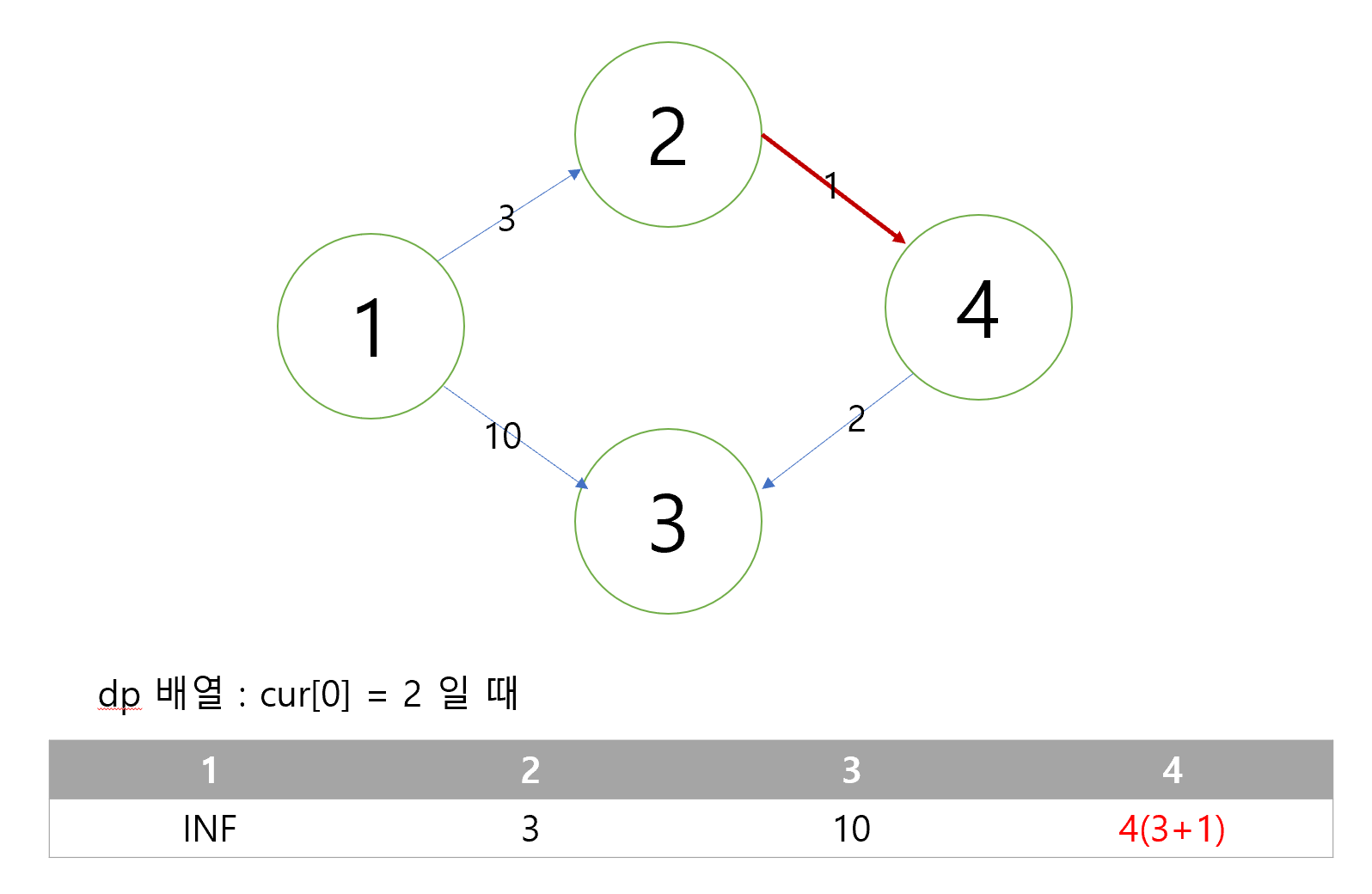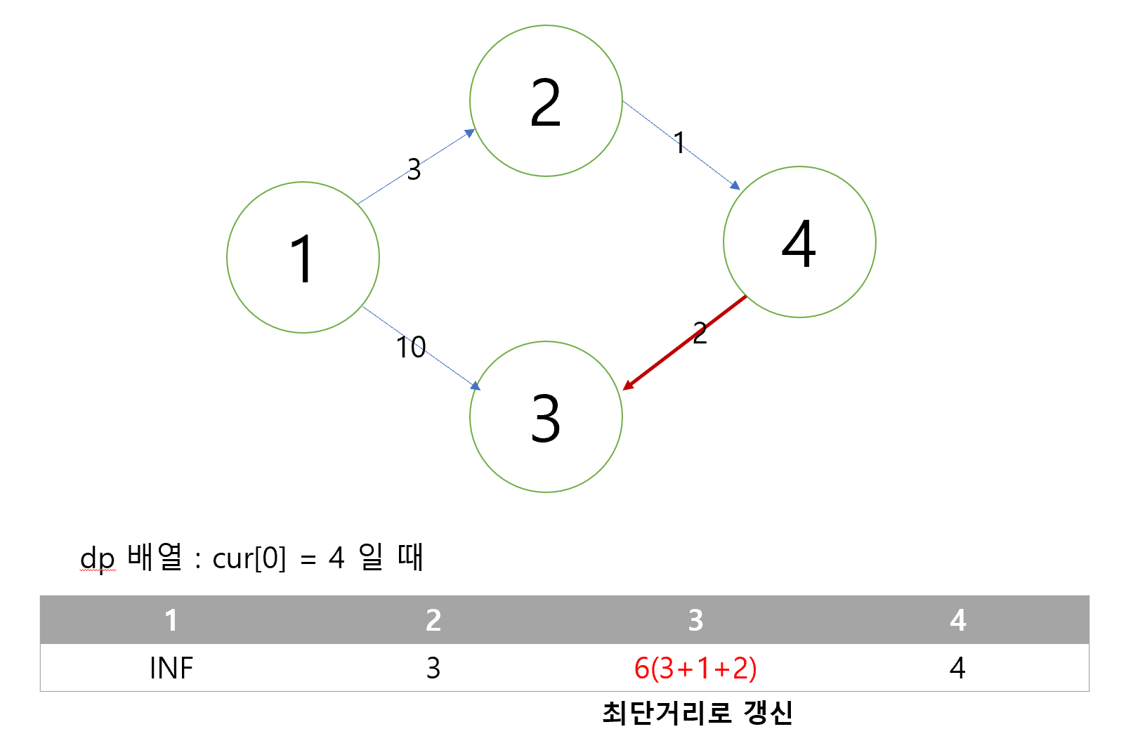 - while문을 돌면서 큐에서 꺼낸 정점과 인접해있는 정점들에 대해 dp배열의 거리와 비교해 더 최단거리일 경우에만 큐에 추가 및 dp배열 갱신