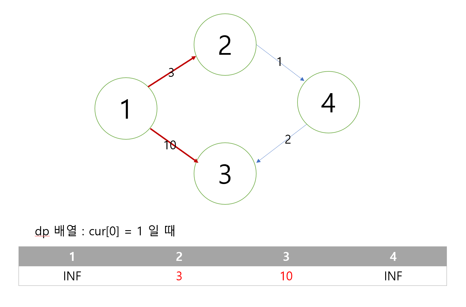 - 1번 정점과 인접한 2(거리:3) 와 3(거리:10)이 큐에 추가되고 dp배열 갱신이 이루어짐.
