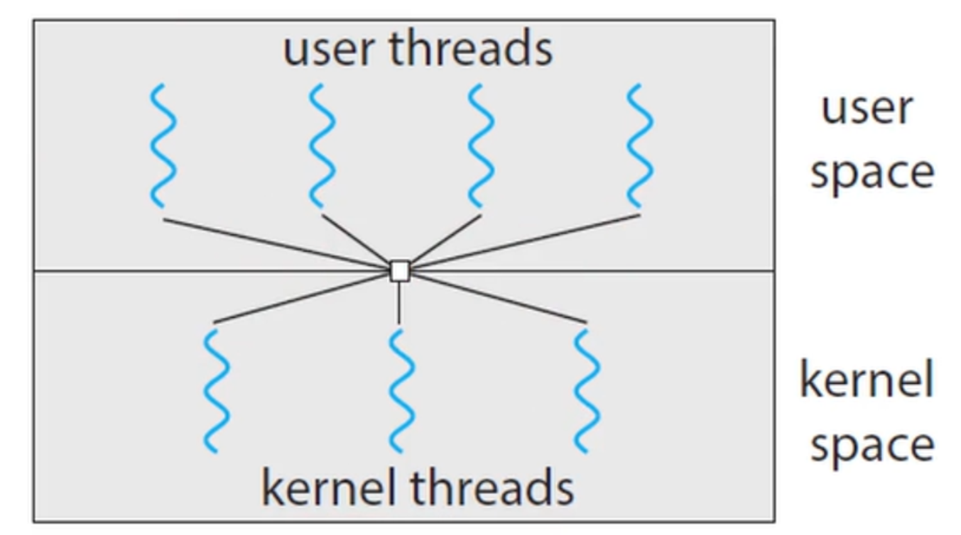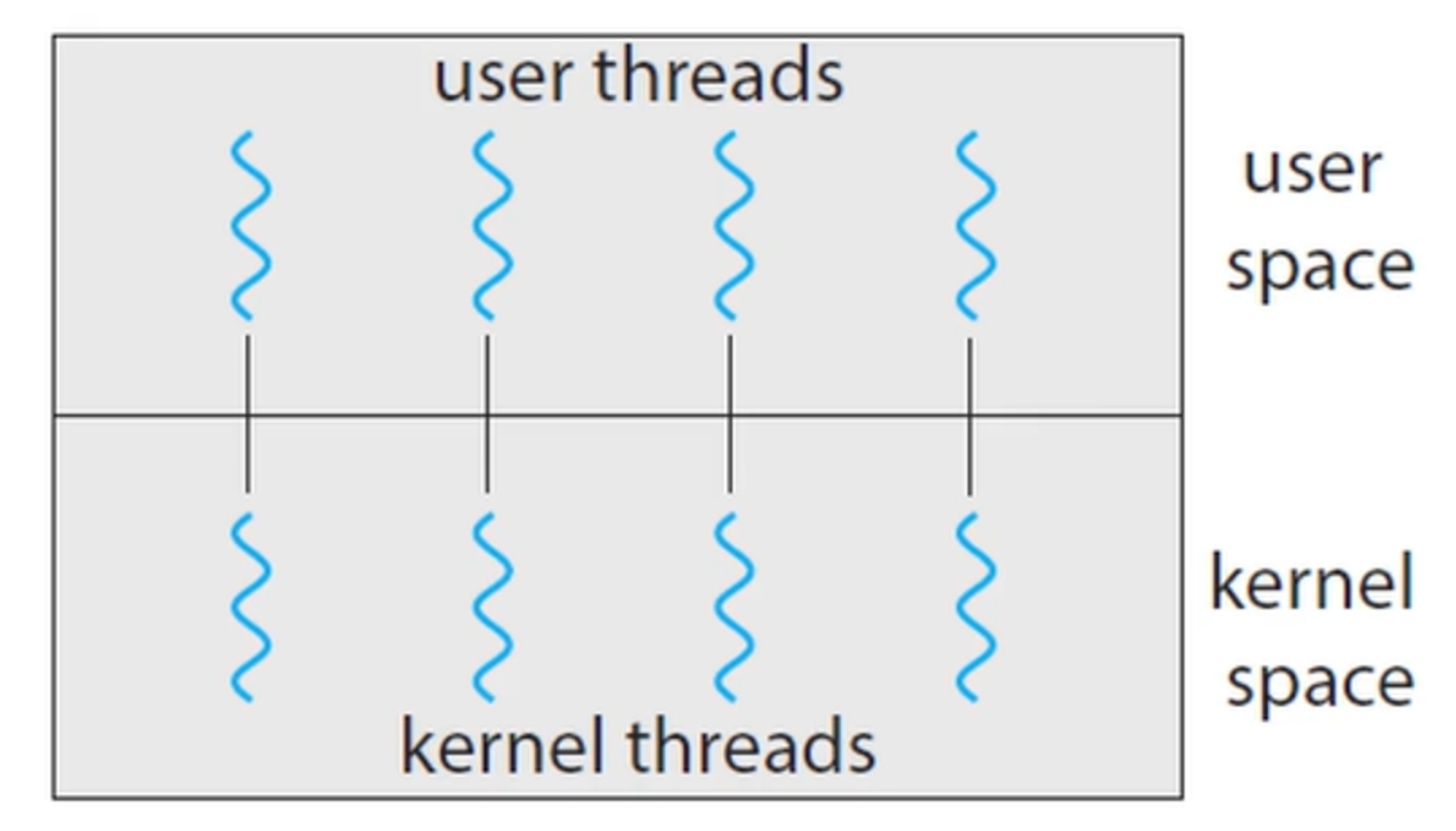 - 단점으로는 User Thread 한 개당 Kernel Thread(OS가 관리해서 속도가 느림)를 같이 만들어야 해서 overhead가 굉장히 큼.