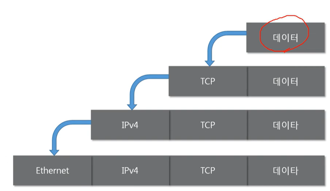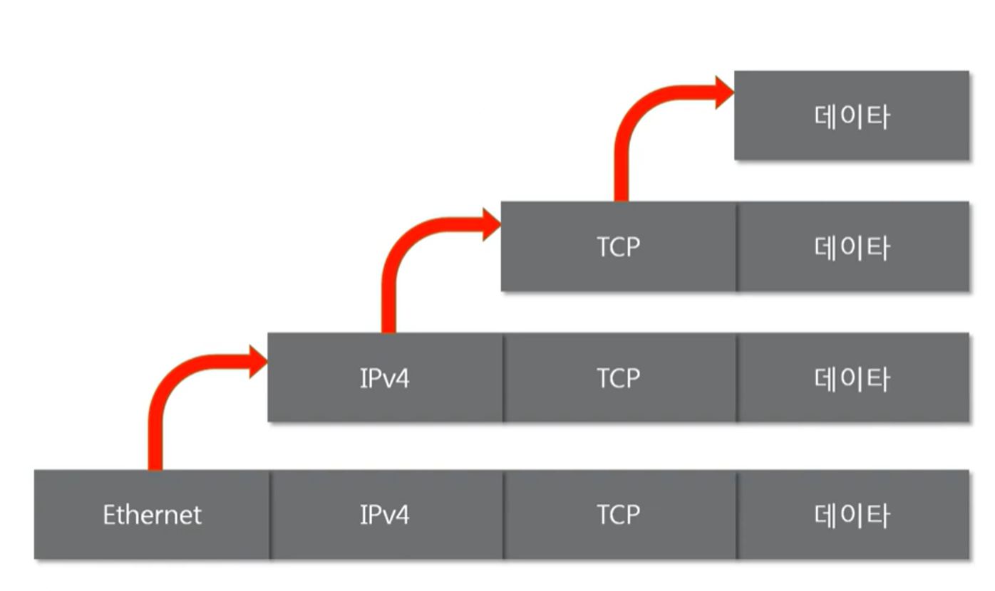 형성된 패킷(헤더:TCP, 페이로드:데이터)을 페이로드로 하고 IPv4라는 프로토콜을 헤더로한 패킷을 또 생성하는 식으로 캡슐화 과정이 진행.