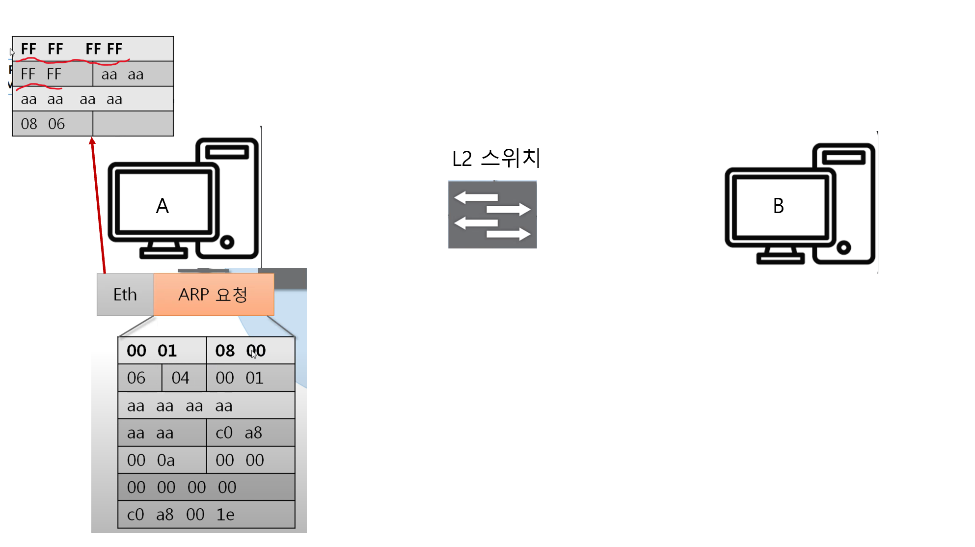 네트워크 중간에 있는 2계층 장비인 Switch는 Ethernet 프로토콜의 목적지 MAC주소(F로 초기화 된 값)를 통해 브로드캐스트인걸 확인하고 모든 장치에 해당 ARP요청을 전송