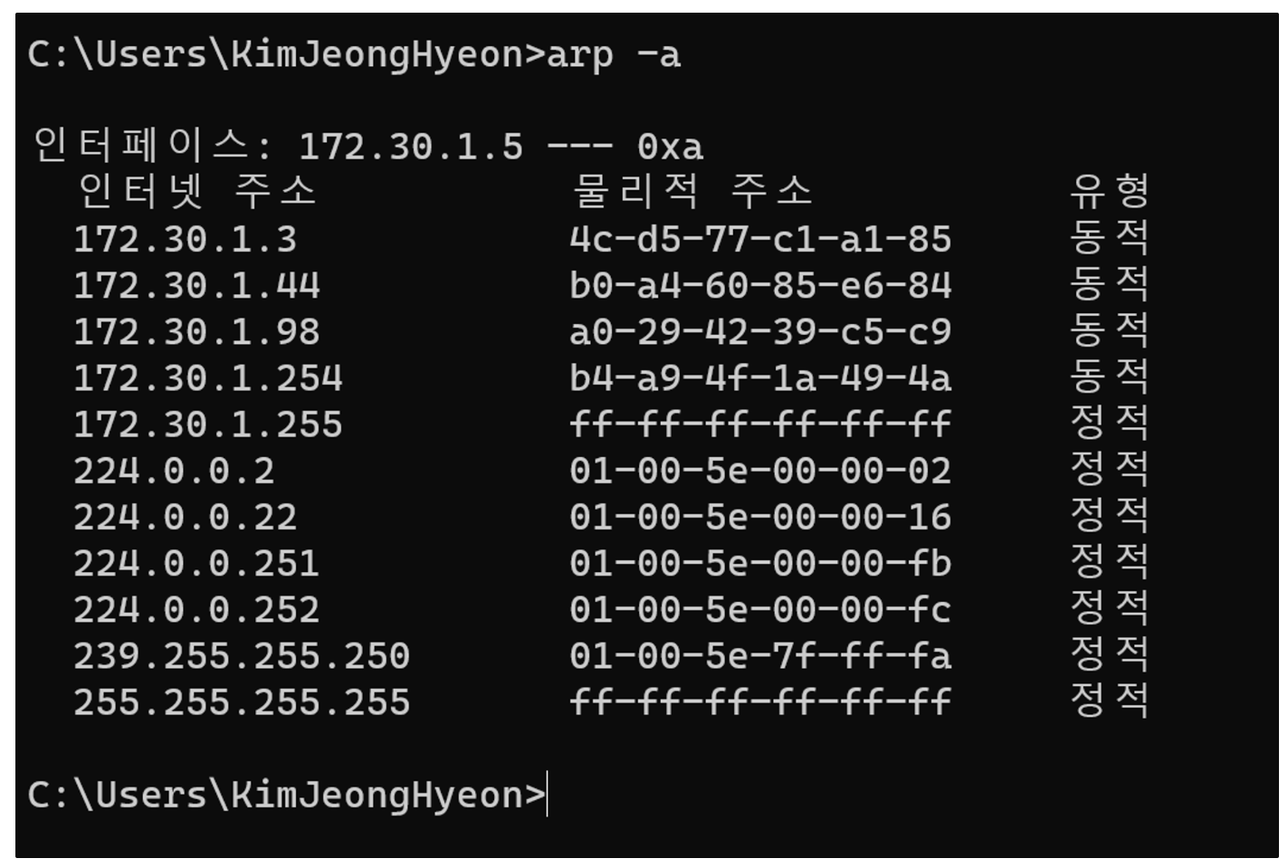 CMD -> arp -a 명령어를 통해 ARP 캐시테이블을 확인할 수 있음.