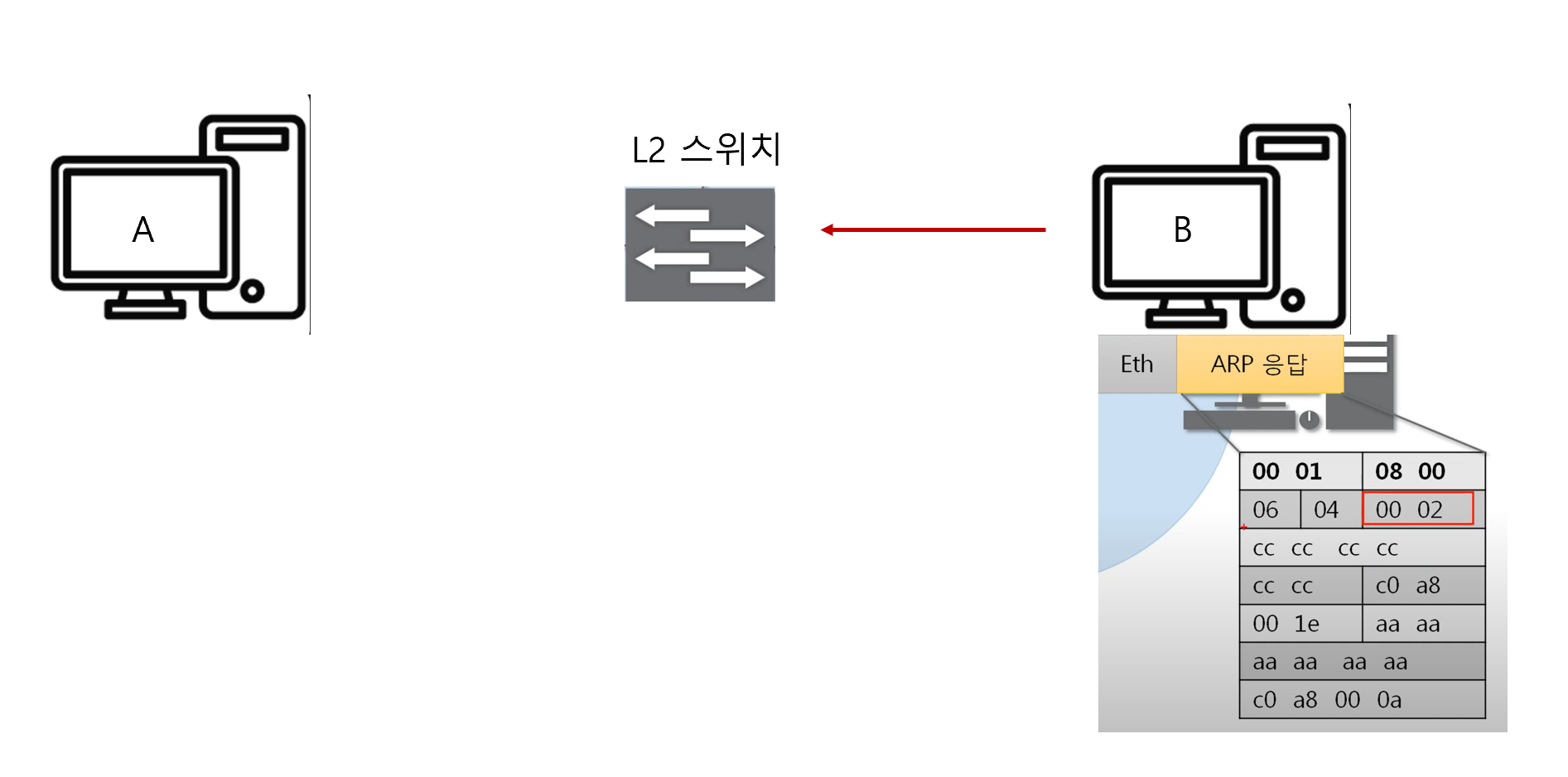 각 장치들은 받은 Ethernet 프로토콜을 역캡슐화를 통해 3계층 ARP 프로토콜의 정보를 열어봄.