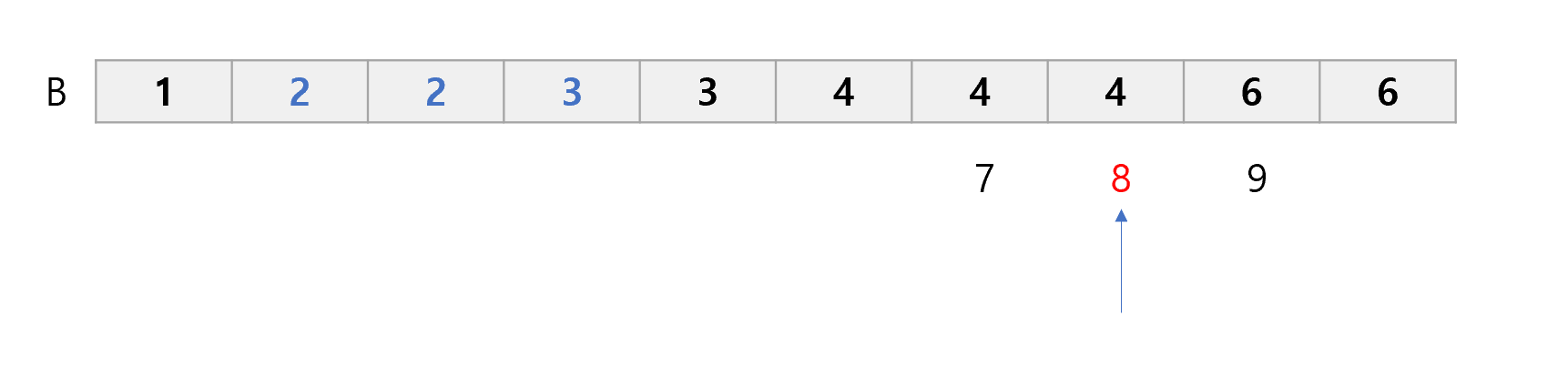 위와 같은 N = 4인 B 배열에서 B[8]을 구하고자 할 때 임의의 값이 5가 될 경우 5보다 작거나 같은 원소의 개수는 8로 K와 같은 값이 되므로 x는 6이 되기 때문에 정해를 구할 수 없게 됨.