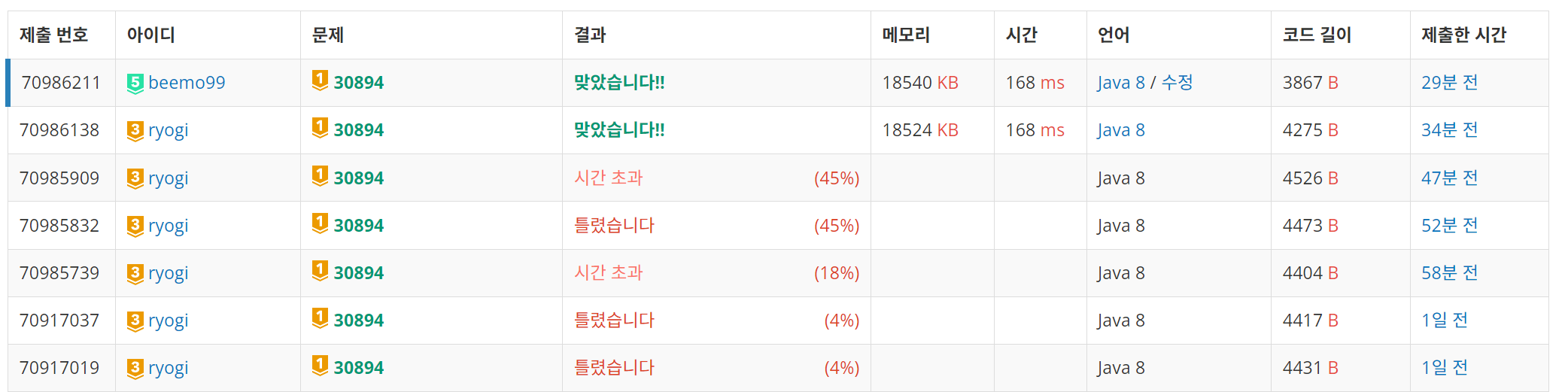보다시피 이번 문제가 상당히 푼 사람이 없었기 때문에 소스코드 참조를 못하는 상황에서 여러번 트라이를 했음...