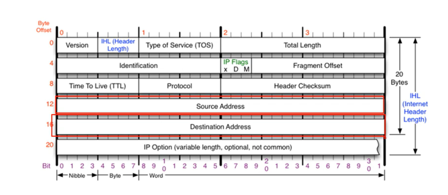 Header Checksum : 헤더가 오류가 있는지 없는지 확인하는 값. 보낼 때 전체 헤더의 값들을 체크하여 값을 지정해서 보내면 수신측은 받고 다시 전체 헤더의 값들을 체크하여 값을 구한 후 해당 Checksum을 확인하여 다르다면 패킷을 버리게 됨.