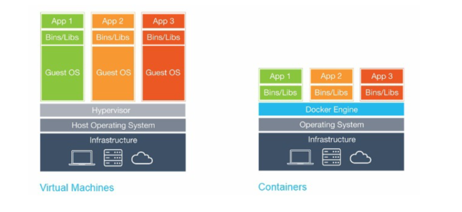 Docker의 경우 OS를 위한 자원을 소비하지 않고 프로그램을 구동하는데 필요한 모든 패키지만 있으면 컨테이너 구동이 가능하기 때문에 자원 측면에서 효율적.