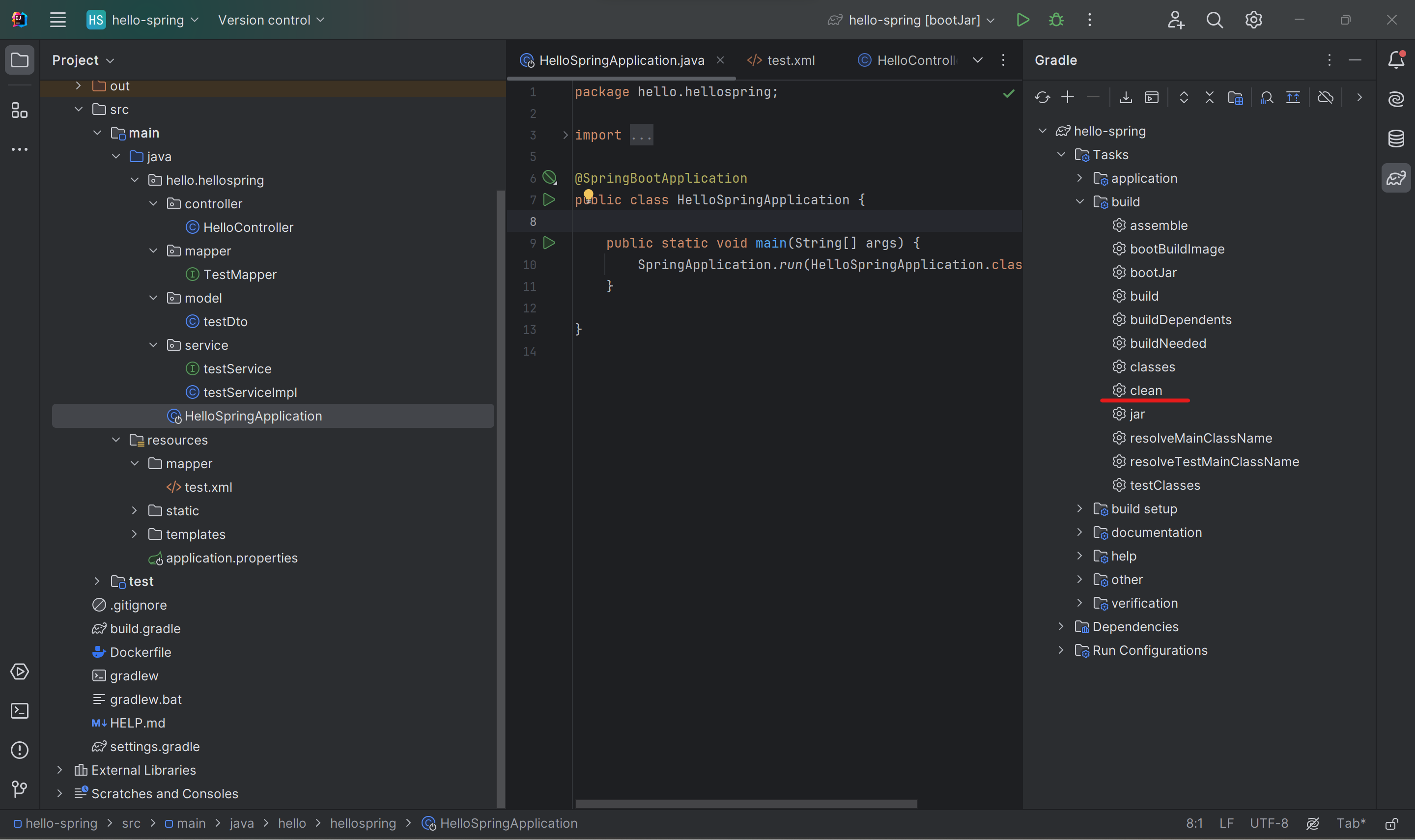 3. Clean 더블클릭 -> Clean의 경우 기존에 생성된 Jar와 관련된 Build 디렉토리 삭제하는 동작을 수행.