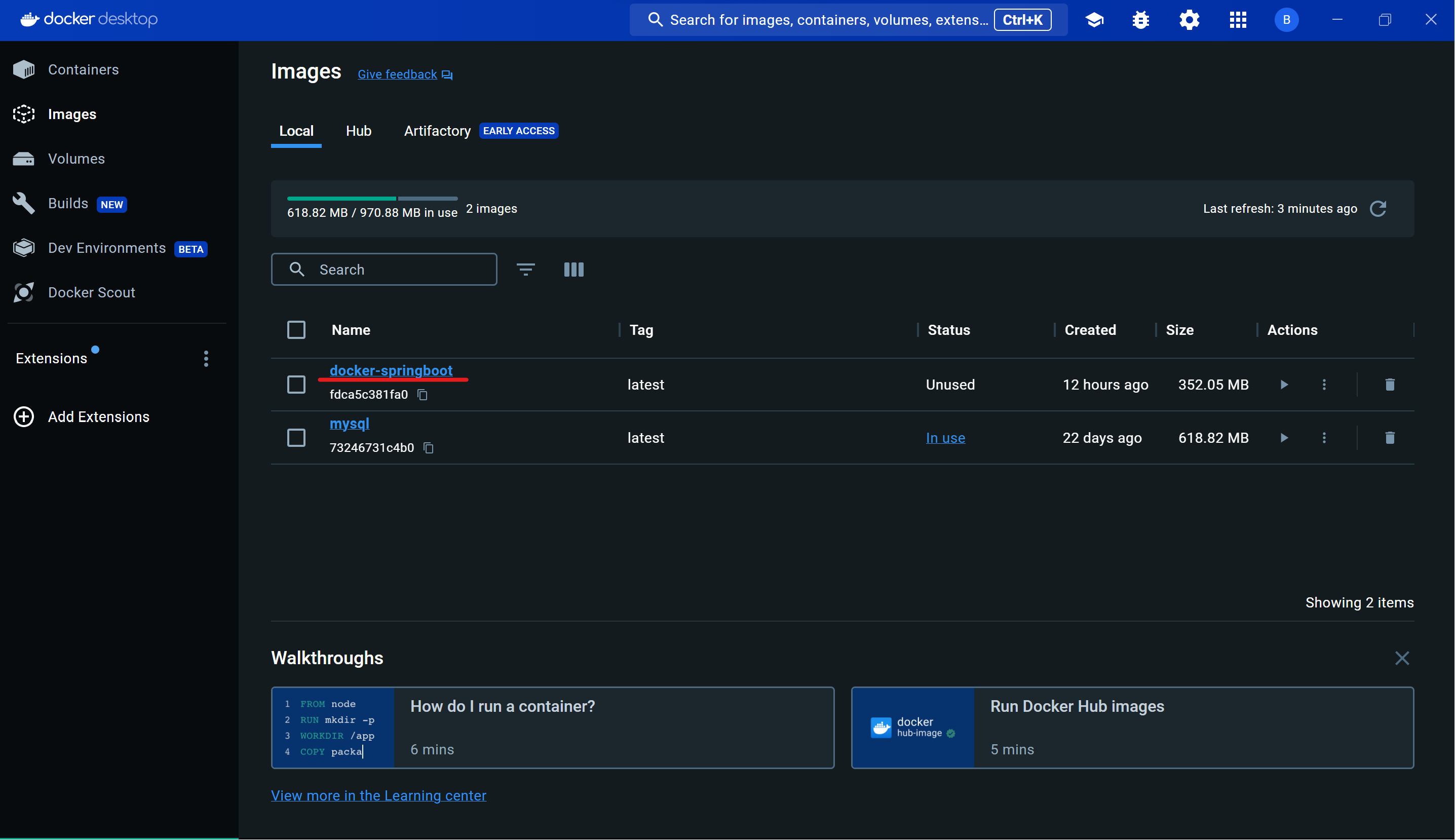 에러없이 실행이 종료되었다면 Docker Desktop을 확인하여 아래처럼 이미지가 생성되었는지 확인.