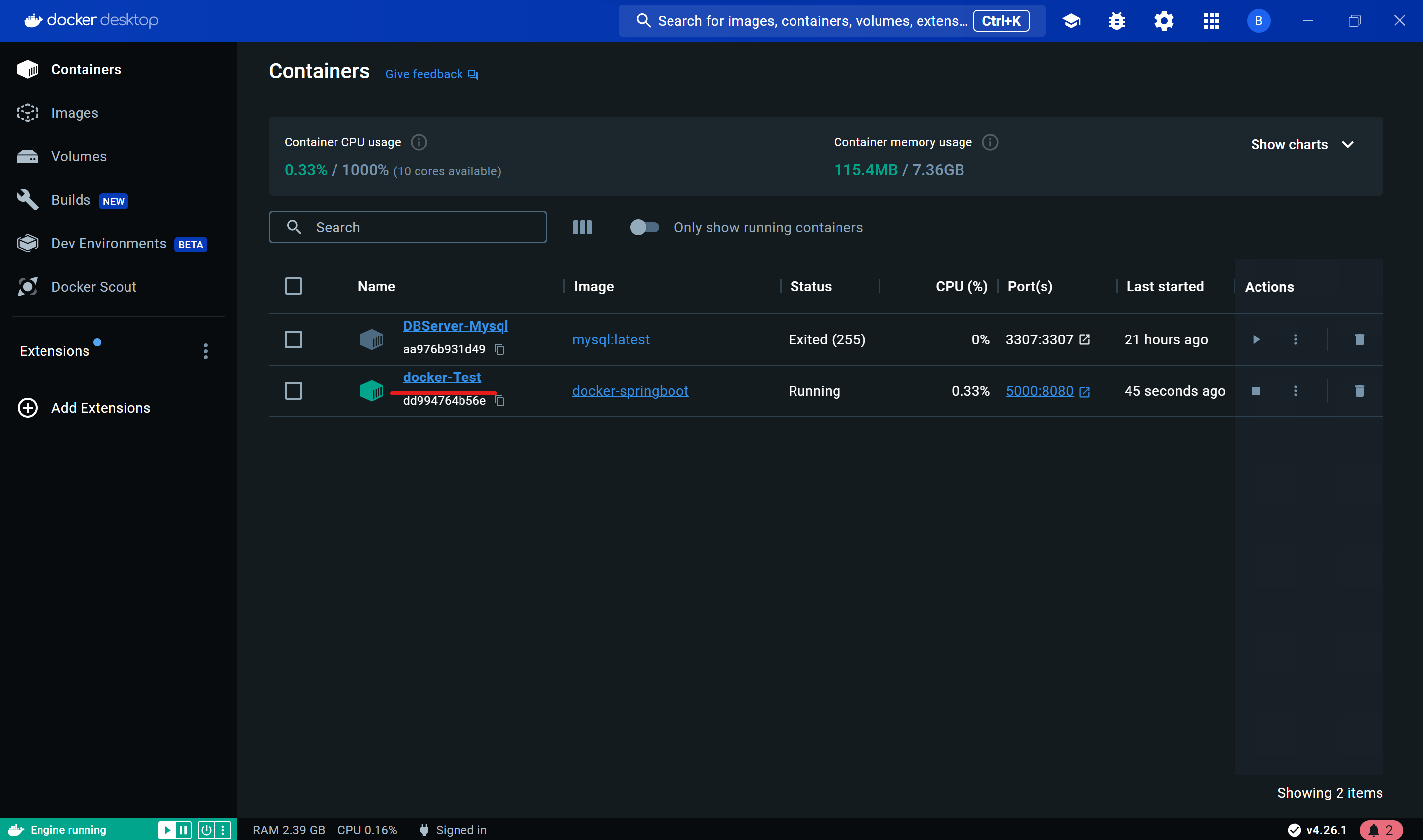 성공적으로 실행이되었다면 Docker Desktop에서 해당 컨테이너 확인.