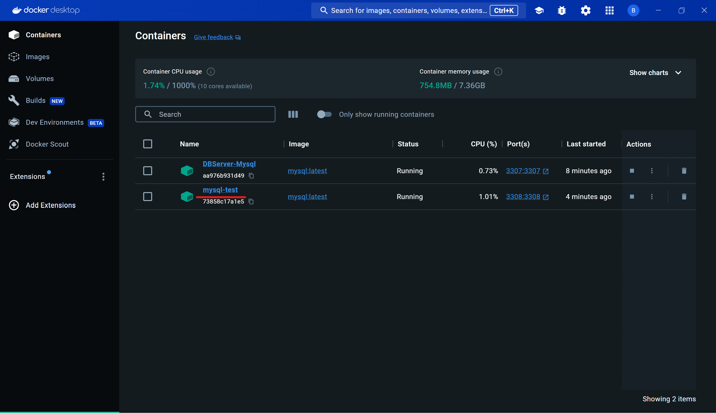 1. Docker Desktop에서 해당하는 Mysql 컨테이너에 접속