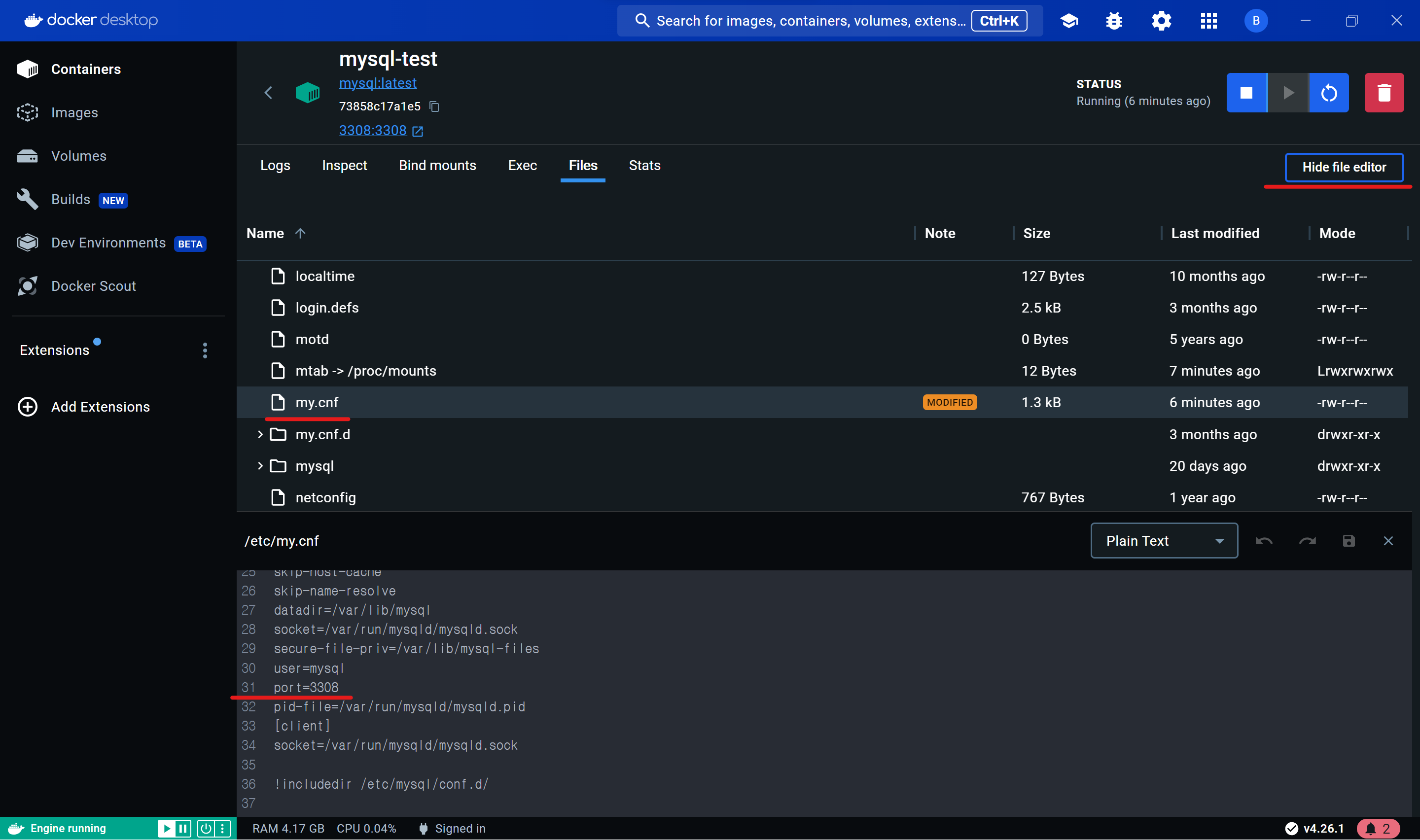 3. my.cnf파일을 찾고 우측 상단 수정버튼을 클릭하여 [port=컨테이너 생성 시 지정한 포트번호]를 작성