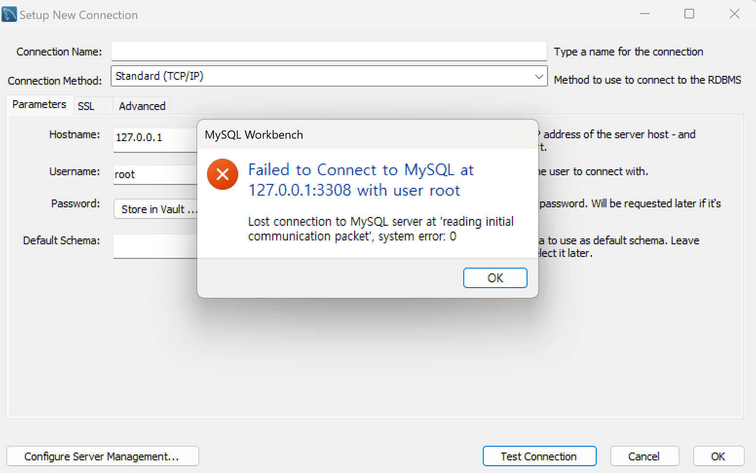 Lost connection to MySQL server at 'reading initial communication packet', system error: 0
