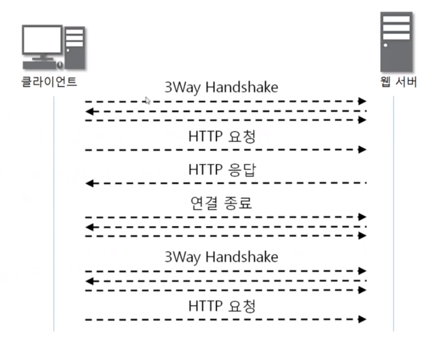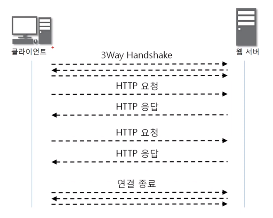 아래와 같이 매 요청마다 3Way Handshake(연결) 과정이 필요.
