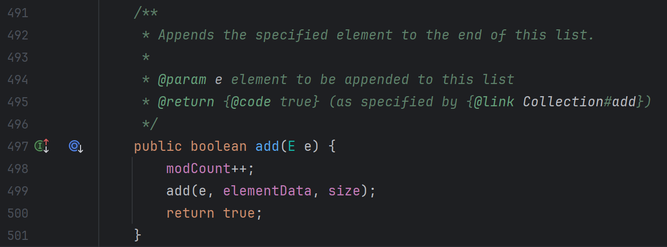 최종적으로 호출한 메서드로 돌아가게 되고 다음 index에 데이터 e가 삽입되고 size를 1 늘려줌으로써 add() 메서드가 종료됩니다.
