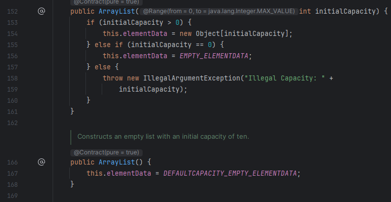 다음은 ArrayList의 생성자로 매개변수로 초기 배열의 크기를 받거나 매개변수없는 생성자를 통해 생성할 시 다음과 같은 default길이로 배열이 생성됩니다.
