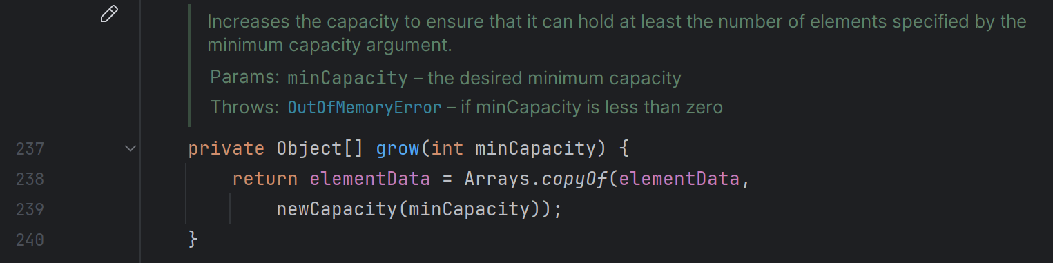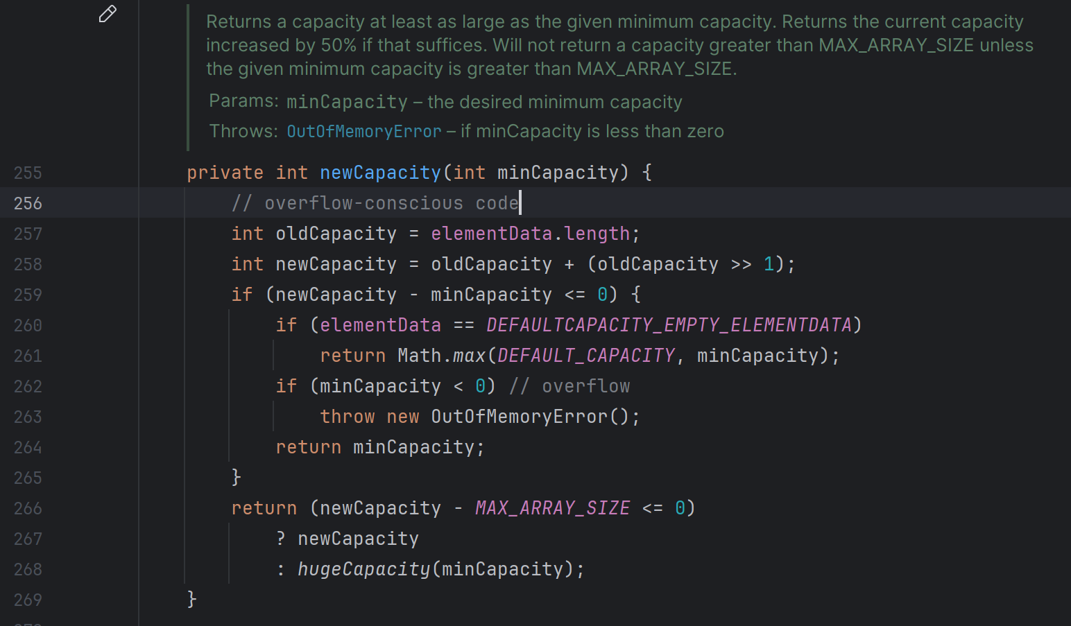 newCapacity 변수는 기존 배열 크기 + 기존 배열 크기 / 2 (shift연산)이라는 새로운 값으로 설정됩니다.
