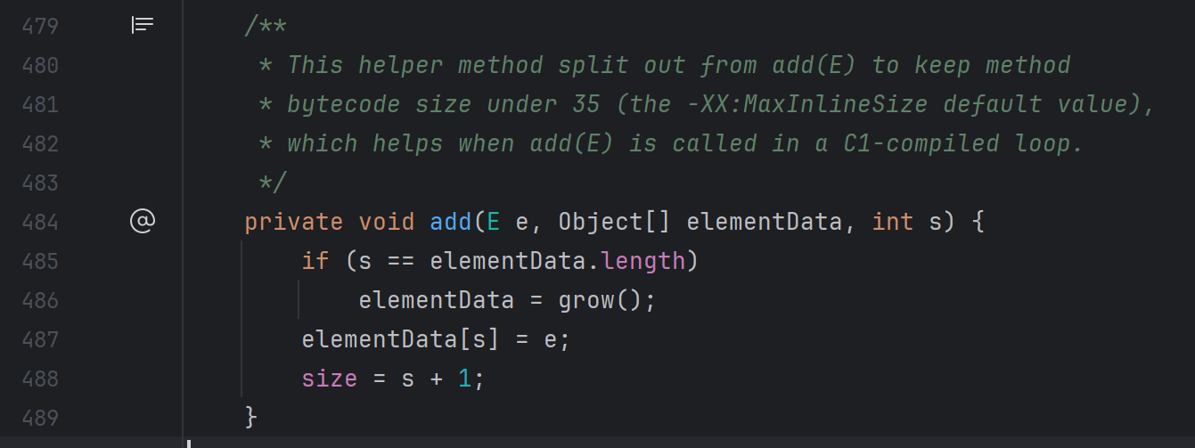 해당 메서드는 삽입하려는 요소(e)와 데이터를 저장하고 있는 배열(elementData), 현재 배열의 길이(s)를 매개변수로 받습니다.