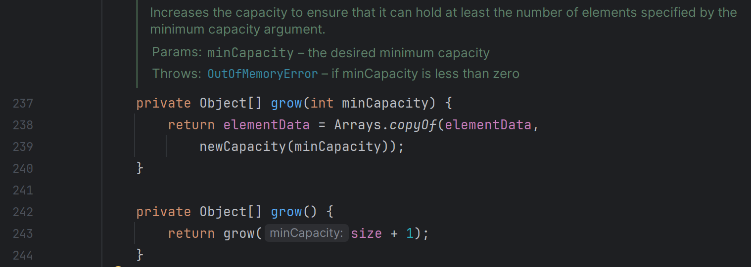 예로 원래 배열의 길이가 10이였다면 새로운 배열의 길이(newCapacity) = 10 + (10/2) = 15가 됩니다.