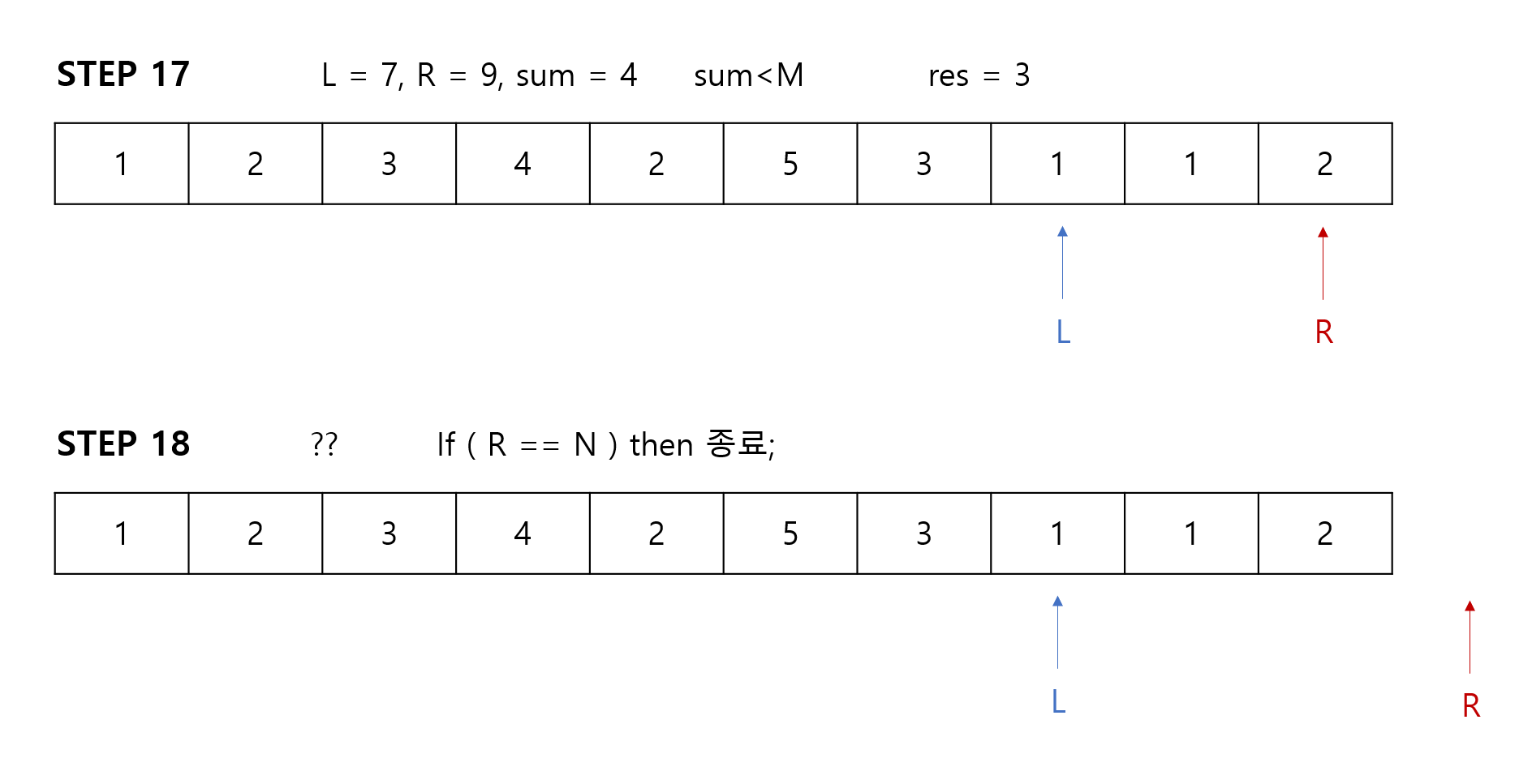 포인터의 이동 과정에서 만약 R포인터가 배열의 길이보다 커지게 되면 함수는 종료됩니다.