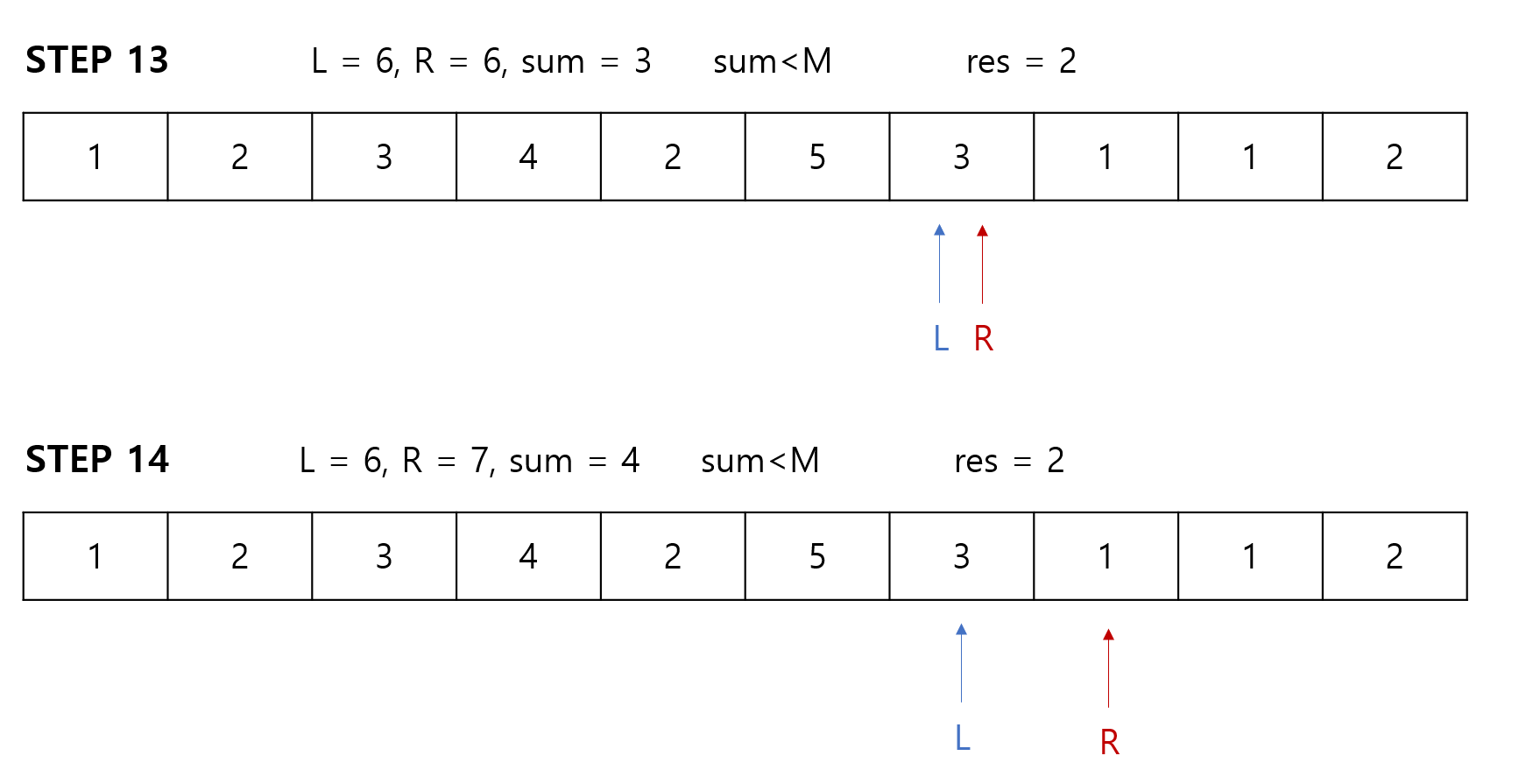 그러므로 기존 수열의 L값을 sum에서 빼고, L포인터를 이동합니다.