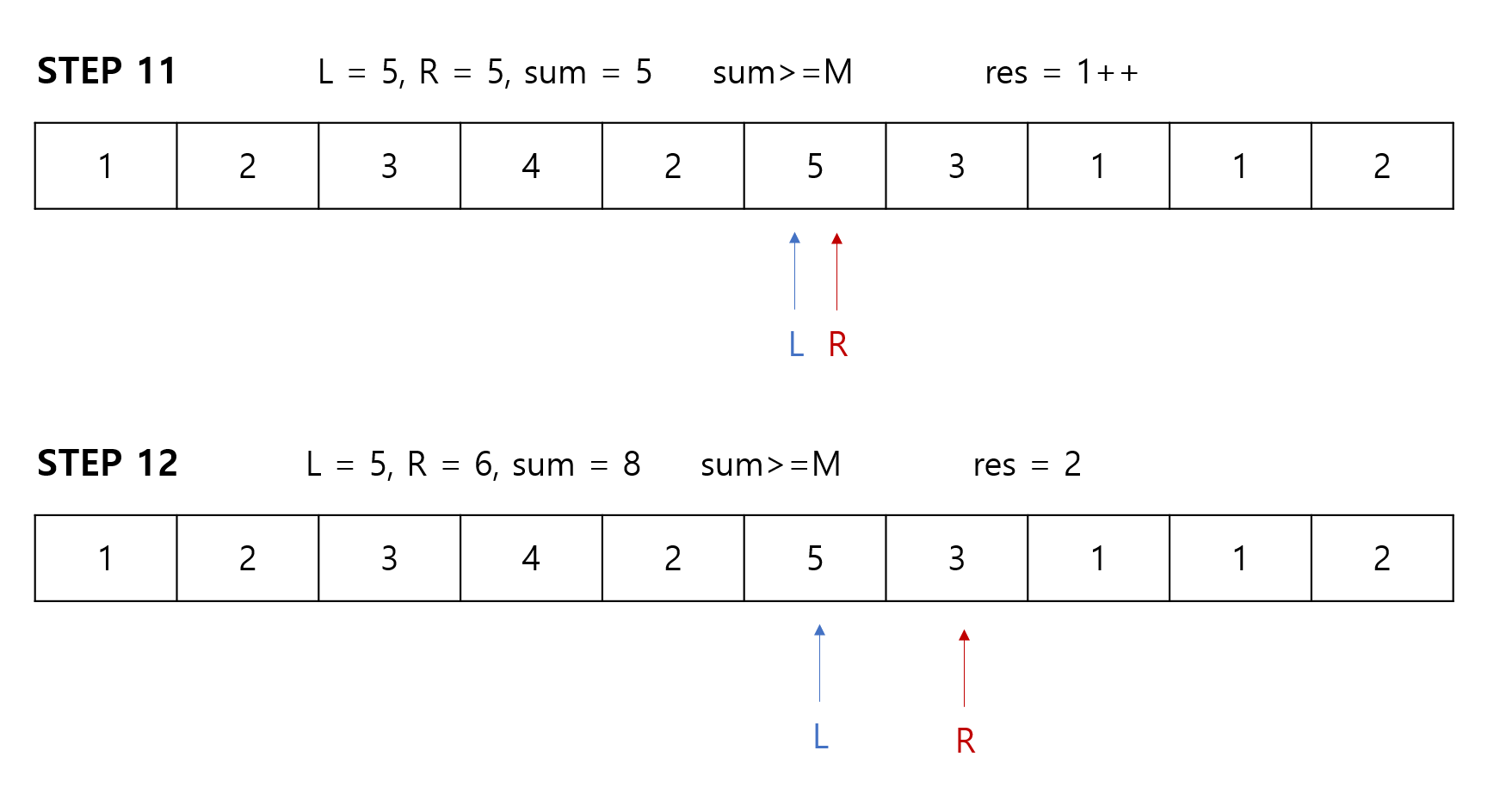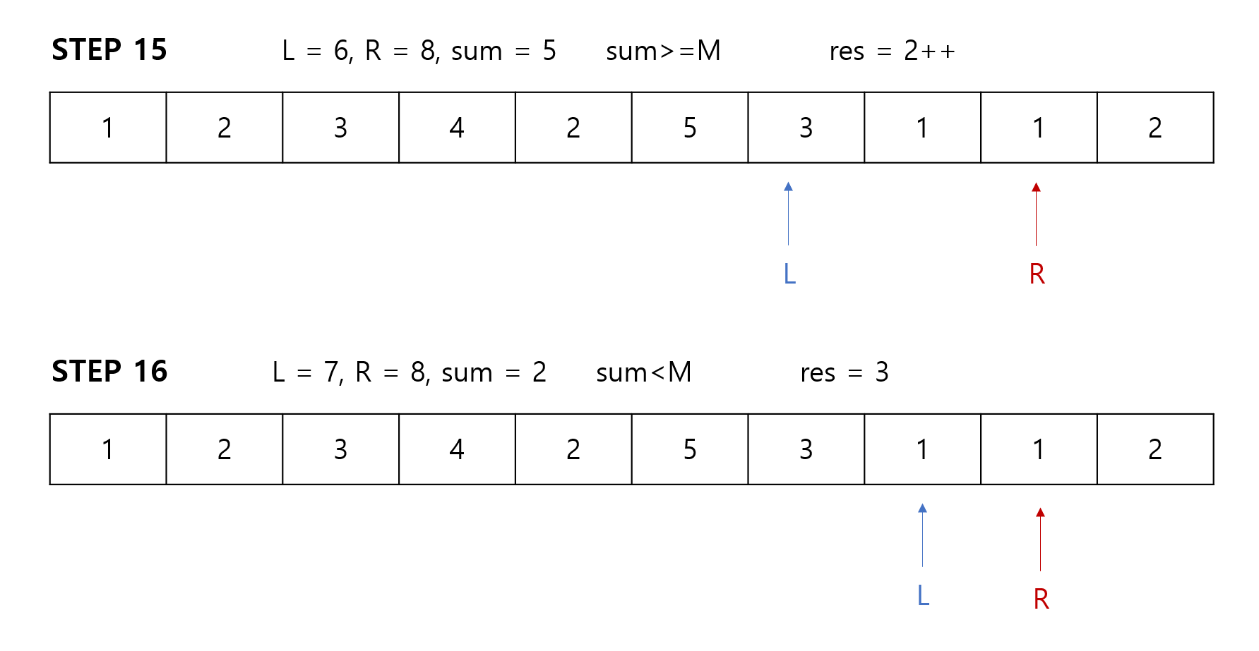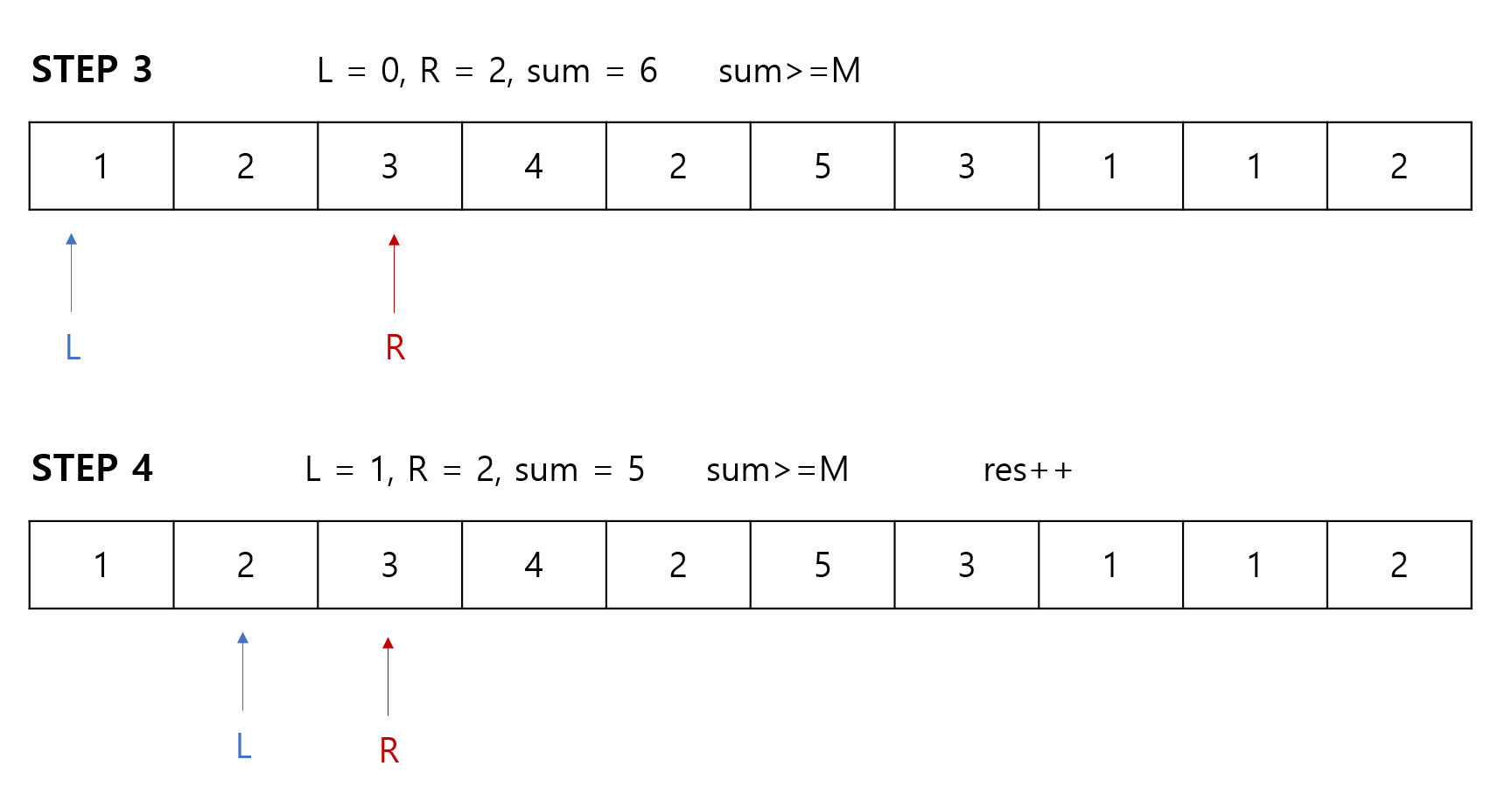 만약 구간합(sum)이 M과 같다면 카운팅을 하고, L포인터를 우측으로 이동합니다.