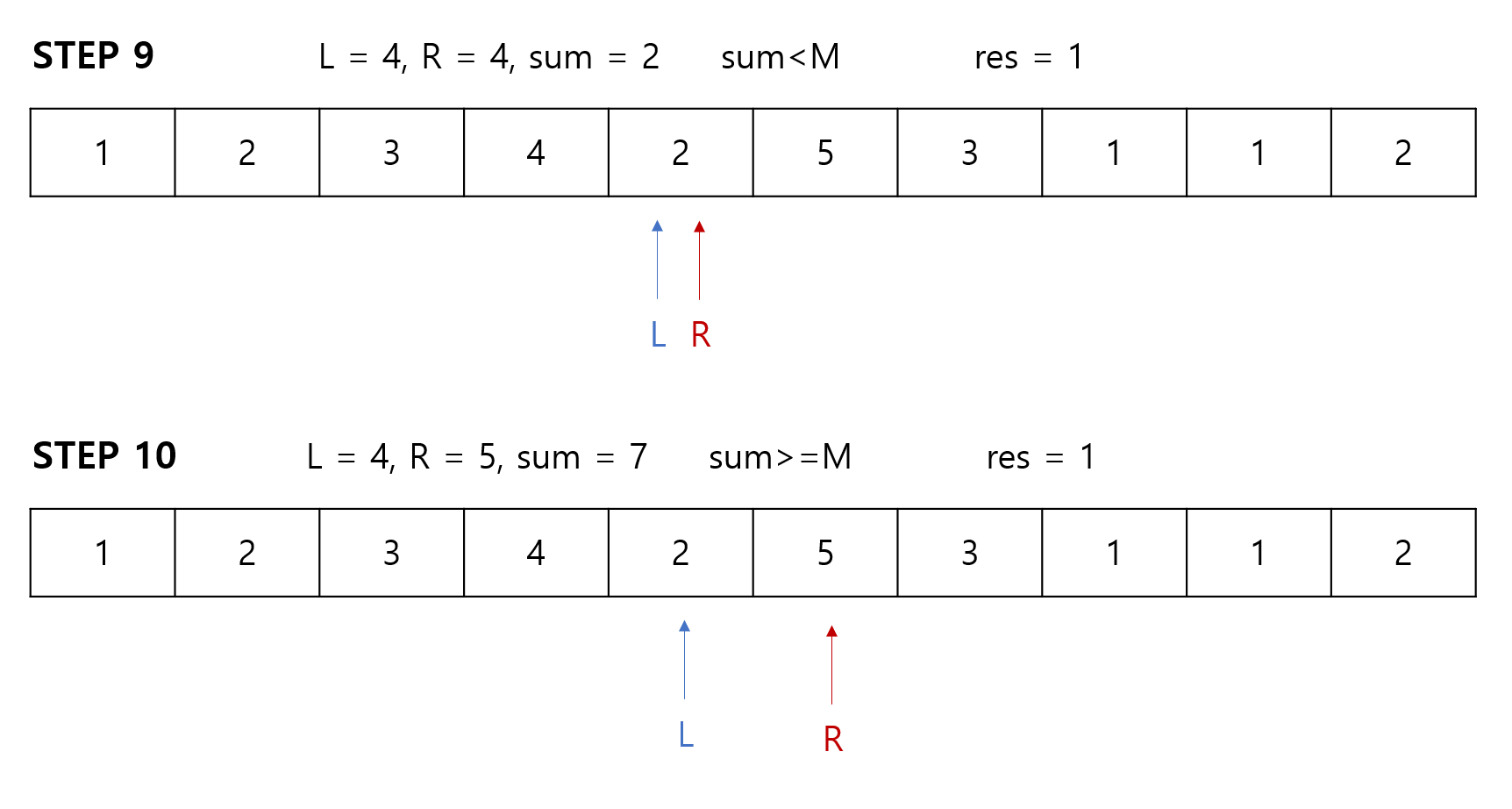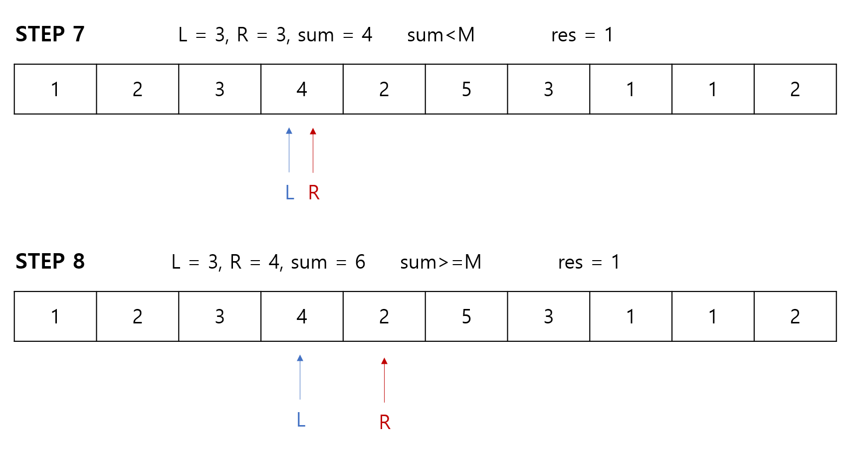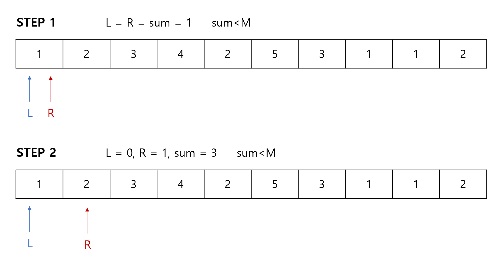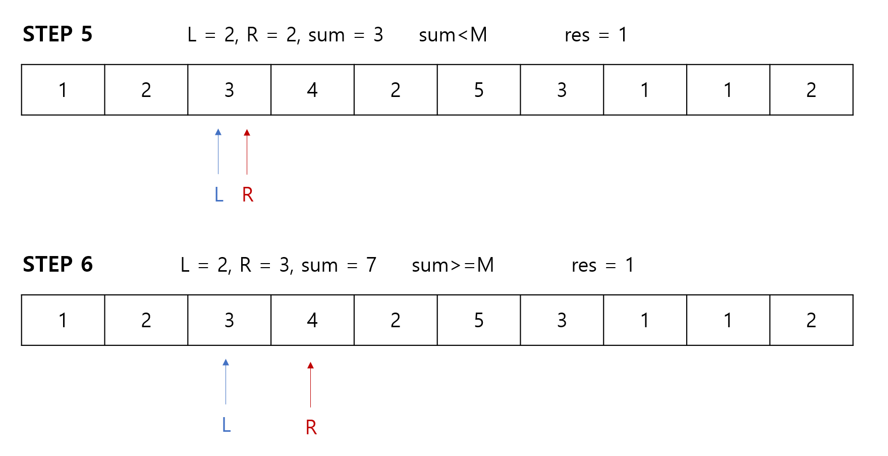 R포인터가 이동하게 되는 이유는 L ~ R의 구간합이 M보다 낮다는 이야기이므로,