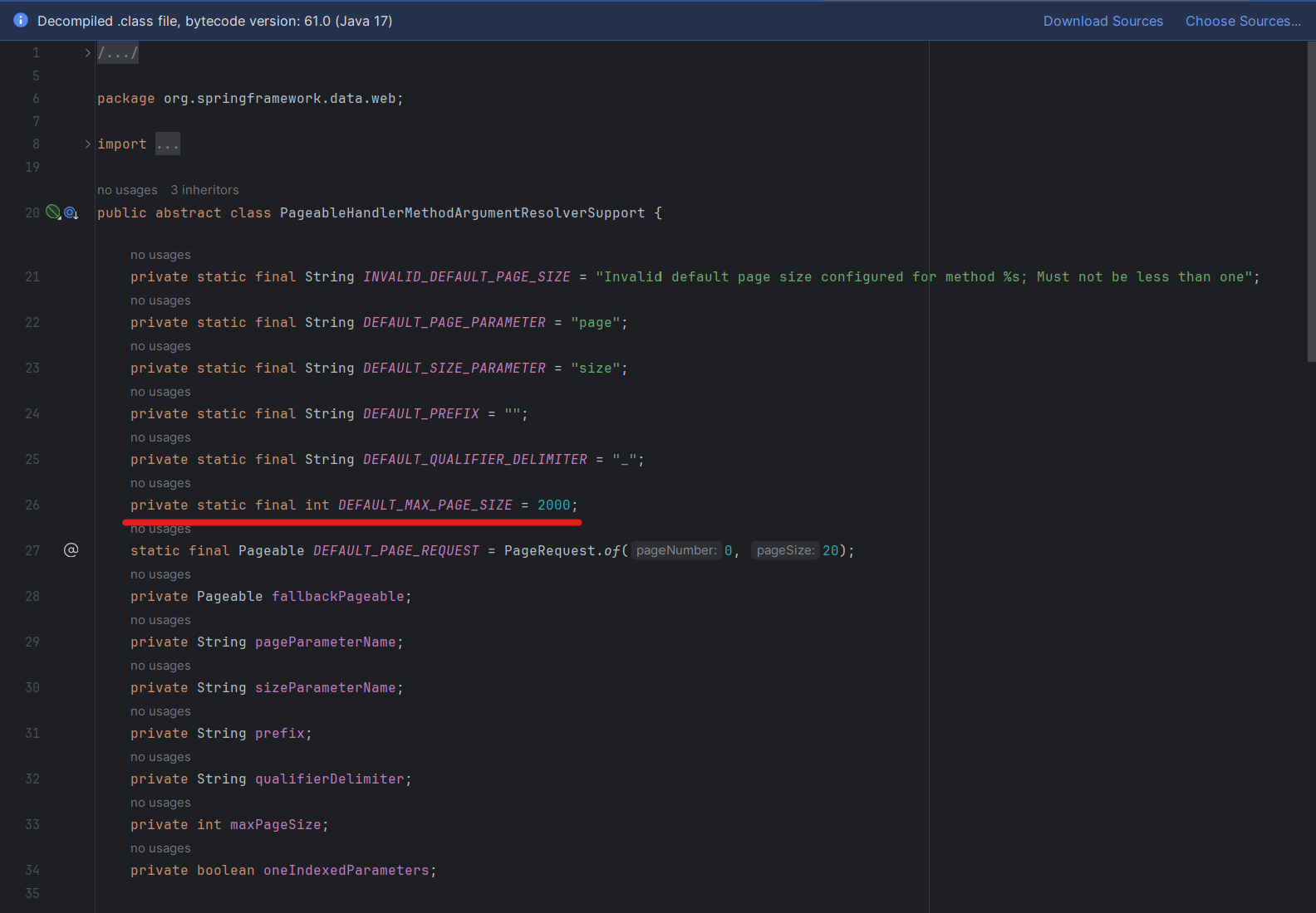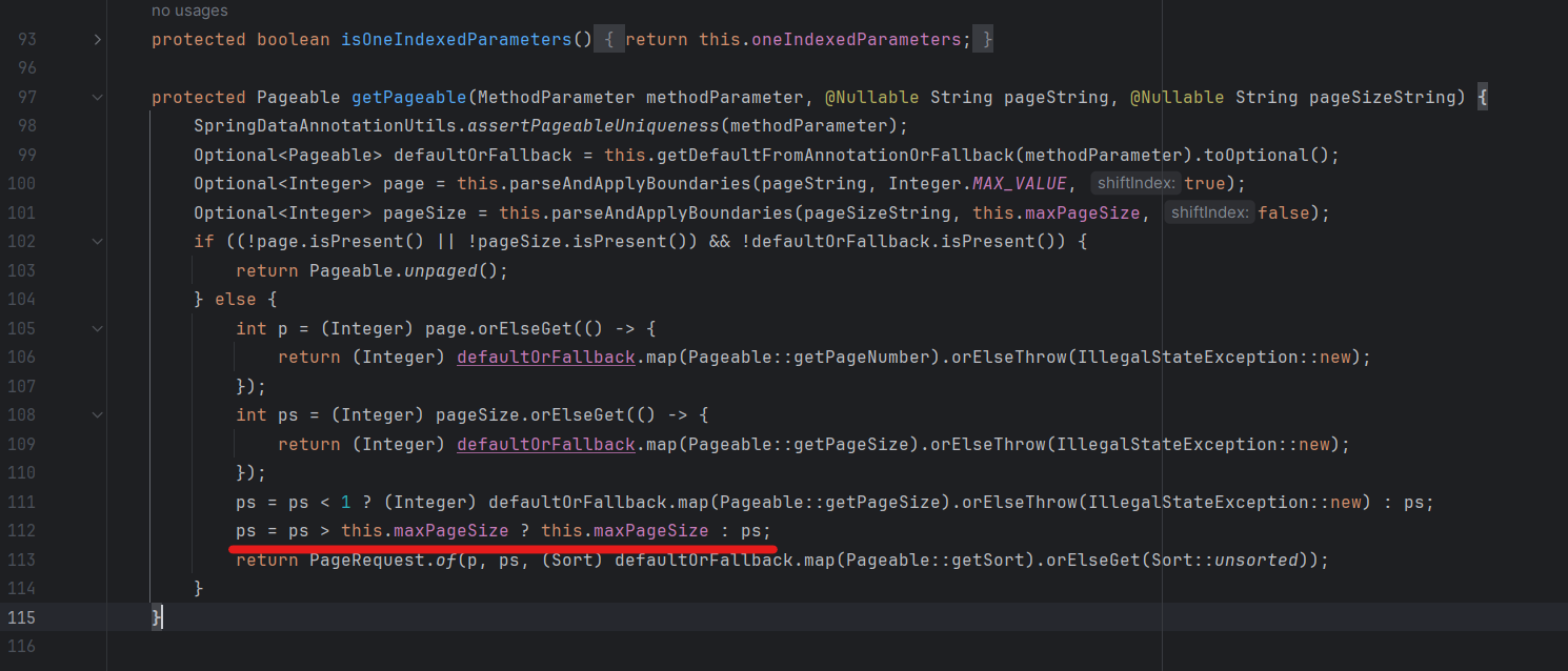 해당 클래스의 메서드를 살펴보면 아래와 같은 메서드가 있는데 빨간색 밑줄을 보면 size가 DEFAULT_MAX_PAGE_SIZE를 넘어갈 경우 고정하는 구문이 있습니다.